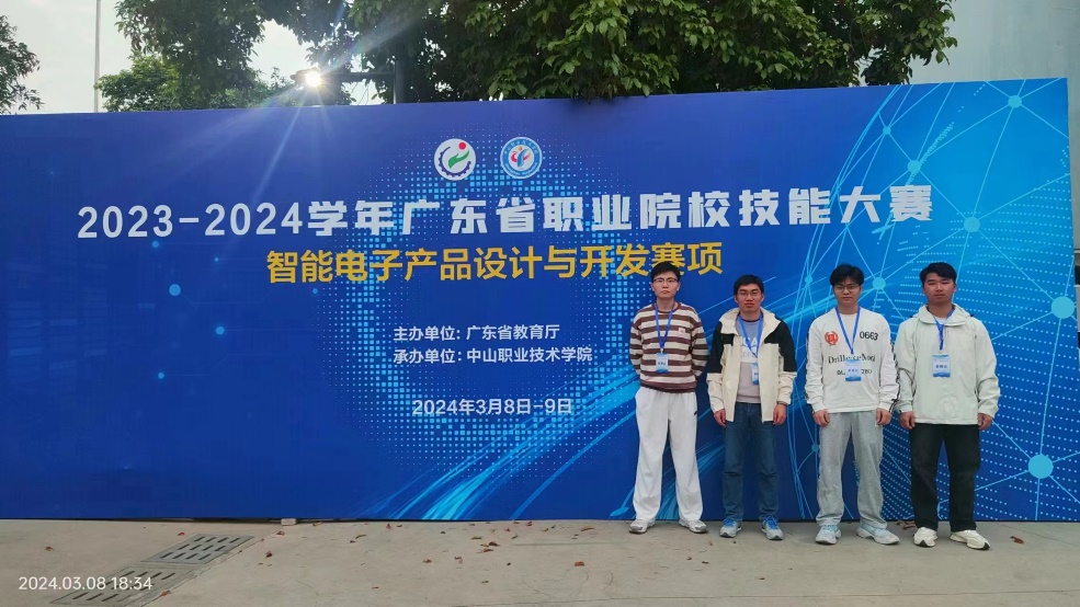 3月8-9日,由广东省教育厅主办的2023-2024年度广东省职业院校技能大赛“智能电子产品设计与开发”赛项在中山职业技术学院举办。大赛吸引了来自全省高职院校的75支队伍参与角逐,我校人工智能学院参赛选手付迎迎(教师)、庄坚泉、魏仰荣、蔡瀚阅在该赛项中荣获一等奖。
