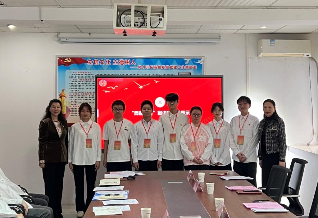 李丽校长和信息工程学院党委桂爱民书记为“青春向党”宣讲团学生党员代表授予胸牌。“青春向党”宣讲团第六期宣讲员代表张赞柳同学以“我心中最美的奋斗者——彭菲”为主题进行了宣讲展示。学生党员代表胡海旭、李湘儿谈了学习党的二十届三中全会精神心得与感悟。