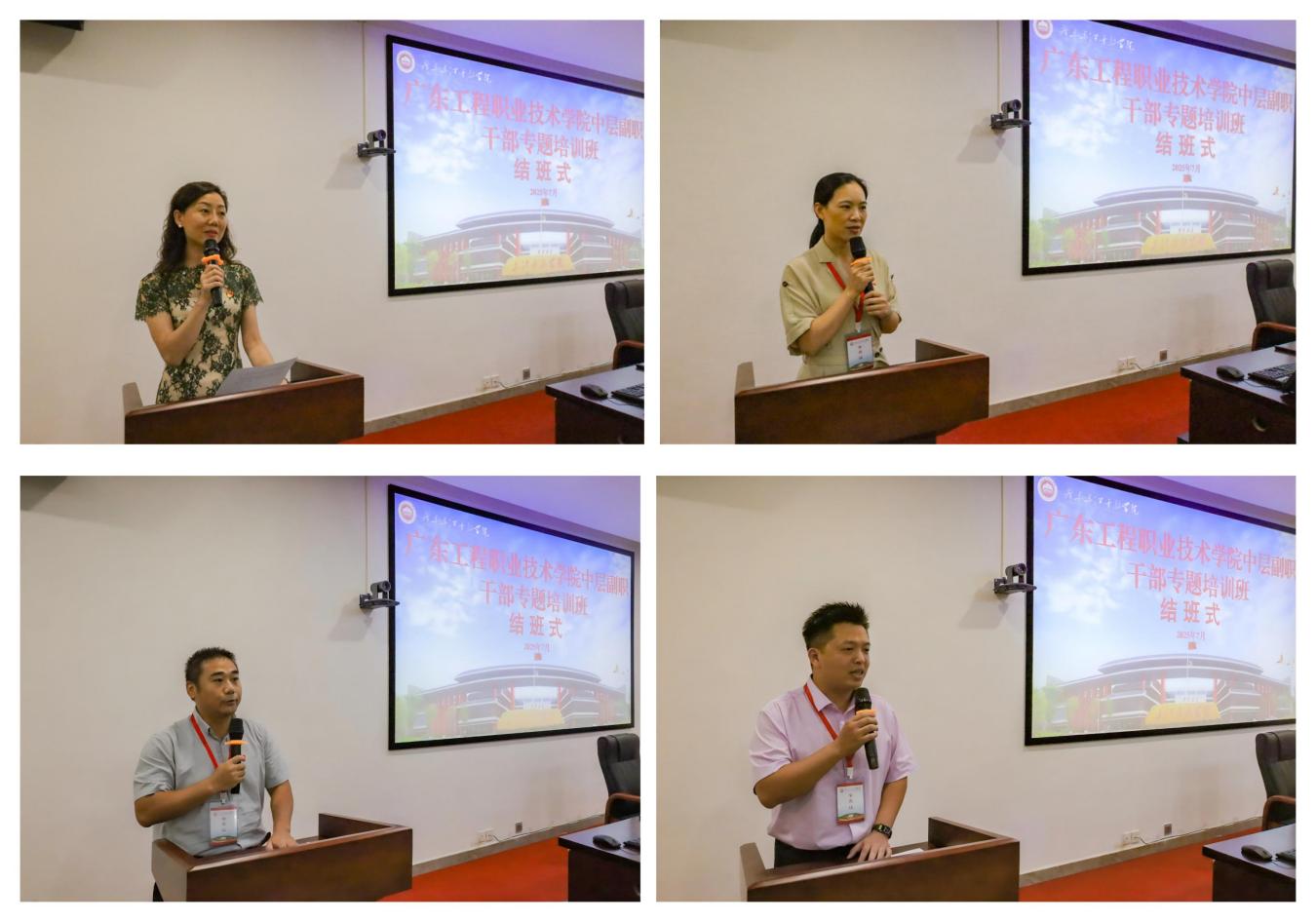 结业式上,学员代表曾名沁、邓大辉、王江丽、丁慧鸽分别从坚定理想信念、传承红色基因、创新工作方法、提升履职能力等方面分享了学习体会。学员们纷纷表示,此次培训学习形式多样、内容充实、组织严密、作风务实,在学思践悟中锤炼了党性修养,开阔了思路视野,提升了素质能力,在研讨交流中互相启发、共同提高,将以此次培训为契机,努力把培训的新收获转化为推动学校中心工作的过硬本领。