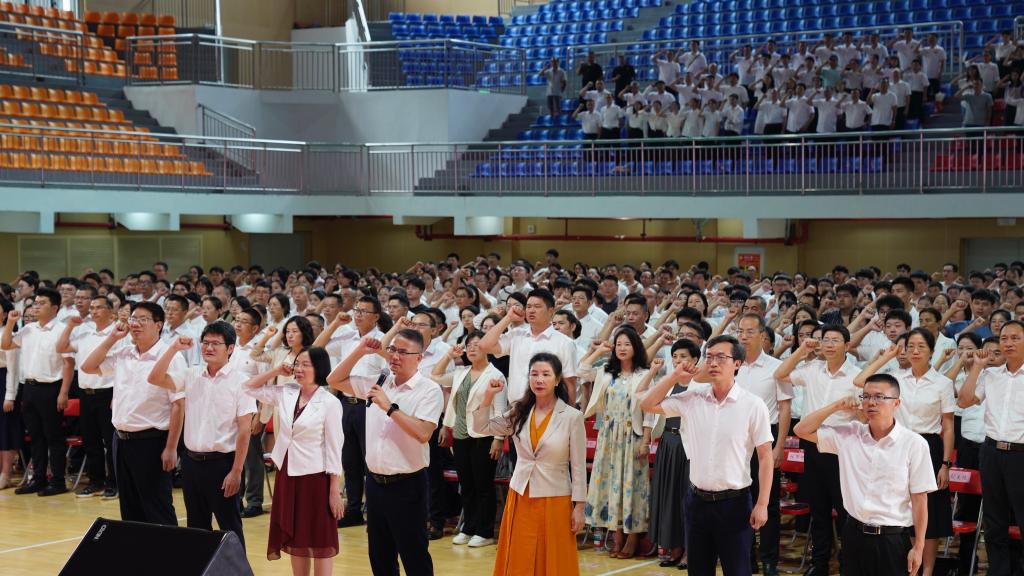 叶忠明书记带领全体教职工面对国旗进行教师宣誓。