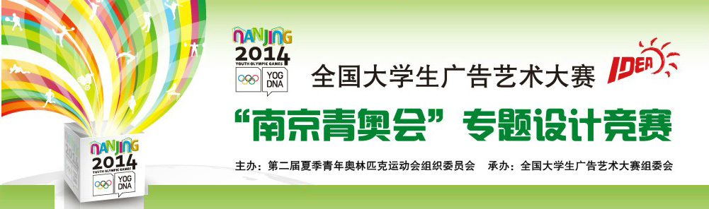 此次全国大学生广告艺术大赛,是以"南京青奥会" 为主题的专题设计竞赛,最高奖项为10万元,征集2014年夏季青年奥林匹克运动会的吉祥物、体育图标和文化教育图标,火炬、火炬塔,颁奖礼仪服装、颁奖台。