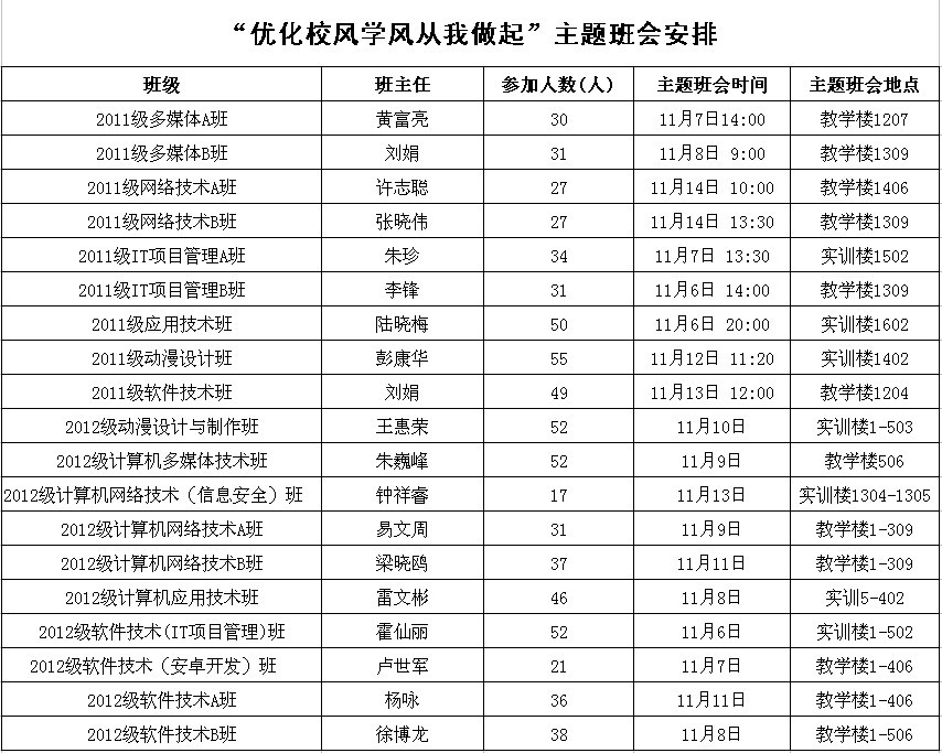 优良的学风校风是关系学院教学质量和壮大发展的重要方面。为了进一步加强学生管理,提高内涵建设水平,促进我系的学风校纪建设,营造良好的育人环境,根据我院《关于开展"倡导广东精神,提升学子素质"学风校纪建设活动的通知》,我系迅速成立组织机构,制定工作计划,开展了相关活动:11月6日,我系召开班主任会议,要求各班主任到各班传达我院通知的精神,并做好相应的学风校风校纪教育。至 11月13日,我系先后召开学生干部会议、"优化校风学风从我做起"主题班会,在认真学习活动方案的基础上,组织每位学生签订《学风校纪建设"十不为"》承诺书,让每个学生对活动有清醒的认识。