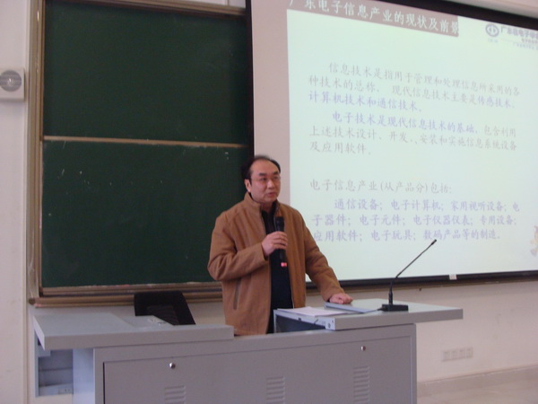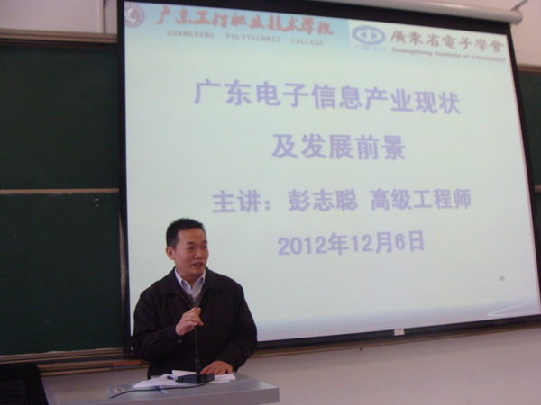 2012年12月6日下午,5号实训楼401教室座无虚席,机电工程系携手广东省电子学会举办了一场"工程素养系列讲坛之广东电子信息产业现状及发展前景专场"讲座。本次讲座由广东省电子学会秘书长彭志聪高级工程师主讲,机电工程系曹立生主任、莫晏光主任助理、电信教研室梁芳芳主任、应电教研室薛金水主任及部分专业教师出席讲座,二百余名同学参加。