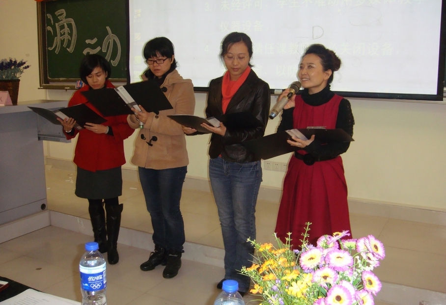 从右至左:焦英、卢壮壮、张霞、郑宇华老师朗诵《盛世中国》