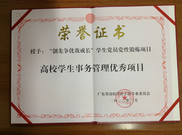 广东省高校学生工作专业委员会举办2012年度"广东省高校学生事务管理优秀项目"评选活动,包括中山大学、华南师范大学等一百多所高等院校参加角逐。设计与艺术系学生工作团队申报的"‘创先争优我成长'学生党员党性锻炼项目"荣获优秀项目,这是代表我校获得团体奖的唯一项目。