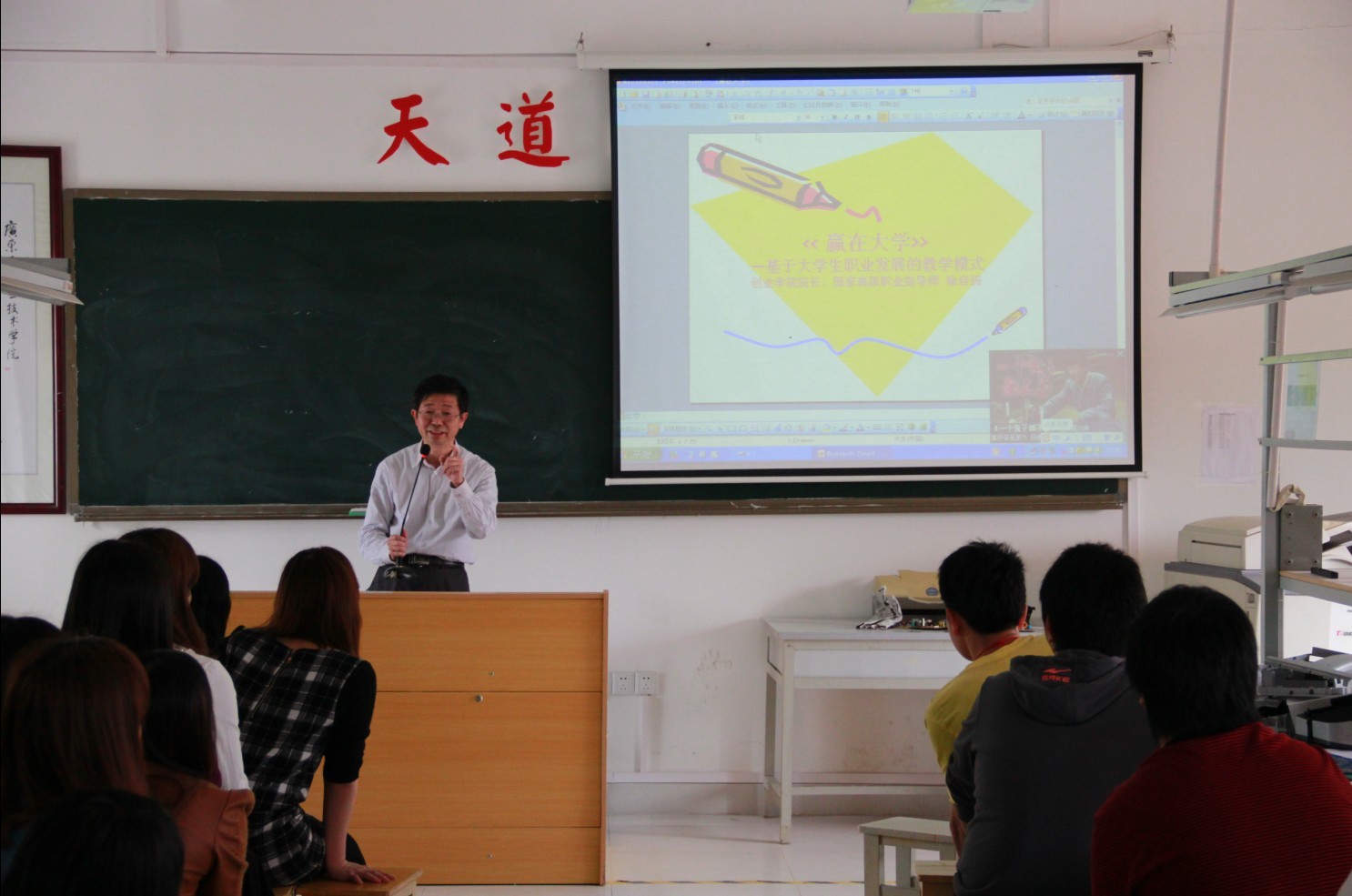 为此,副院级干部、创业学院负责人徐启扬为2012级电子商务创业班的同学们上了《赢在大学》创业第一课。课堂上,徐老师通过"与卓越同行"的视频材料,和同学们共同讨论开设电子商务创业班的目的意义,引起了同学们的积极思考和热烈讨论。