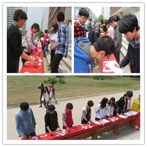 4月12日上午,"书香伴我行,我以书为友"签名活动和"图书馆读者借阅排行榜"启动活动在图书馆大楼门前举行,拉开了本次4.23读书活动月的序幕。学院领导胡艳曦副院长、院学生工作部的老师们、图书馆老师们、院读者协会会员以及众多师生参加了活动并在"读书活动月"宣传条幅上签名。