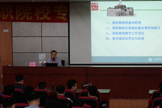 5月8日下午的主讲嘉宾是广州番禺职业技术学院人事处处长刘佳环教授,主题为"让自己成为一名优秀的高职教师",刘佳环教授从高校教师的基本职责、高职教师应具备的基本素质和能力、高职教师教学工作规范、教学奖励与教学事故等四个方面详细讲解如何成为一名优秀的高职教师,并就高职教师与普通高校教师的素质要求有什么区别?人才培养方案和课程标准的制定只是专业负责人的职责吗?课程标准的作用是什么?如何看待教师专业自主权与教学规范的关系等大家关注的问题进行探讨;让老师们更加明确自己作为一名高职教师应具备的基本素质,今后提升的方向以及肩上的责任;特别是给青年教师上了一堂生动的教师职业道德培训课,提出"热爱教育是前提、遵守规范是基础、提高能力是保证、追求事业是境界"与老师们共勉。
