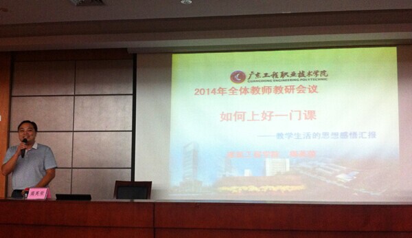 学校始终将培养高素质技术技能型人才当成第一要务,而落实这一要务的核心工作在于深化教学工作。2014年10月17日下午,由教学质量监控处和教务处在图书馆报告厅联合组织了以"开放共享,协同创新"为主题的全体教师教学经验分享会,参加人员有陈杰伦、朱文坚督学,肖萍处长,各二级学院(部)全体专任教师、校内兼课教师及教务处相关人员共100多人,会议由教务处副处长吴文丰主持。