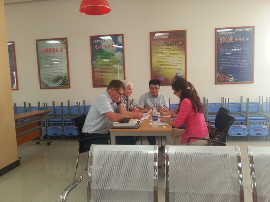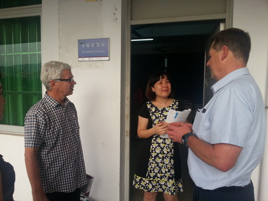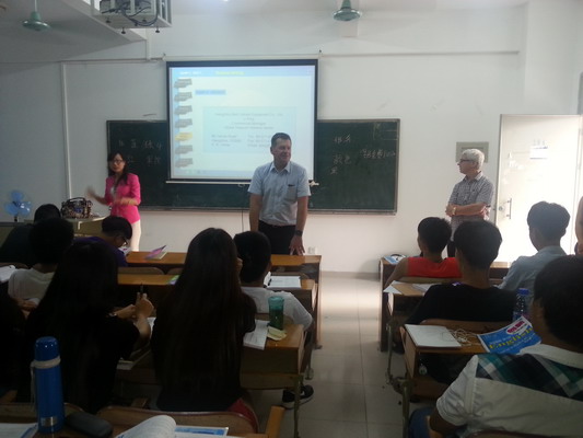 David White一行与国际学院韩立芳副院长、邱志远、武丽茹等老师一起对我校合作办学的专业课程设置进行了深入的、详细的研究讨论,并敲定了加快落实课程方案。Steve Dickens与国际学院学生进行了系统的英语测试,和学校的Kent、刘卫星、黄华、许泳宪、朱晓丹等多名英语授课老师代表进行了详细的交流,进一步研讨了加强国际学院学生英语教学的方案,尽一切努力提高学生的英语水平,确保配合专业教学任务的完成。