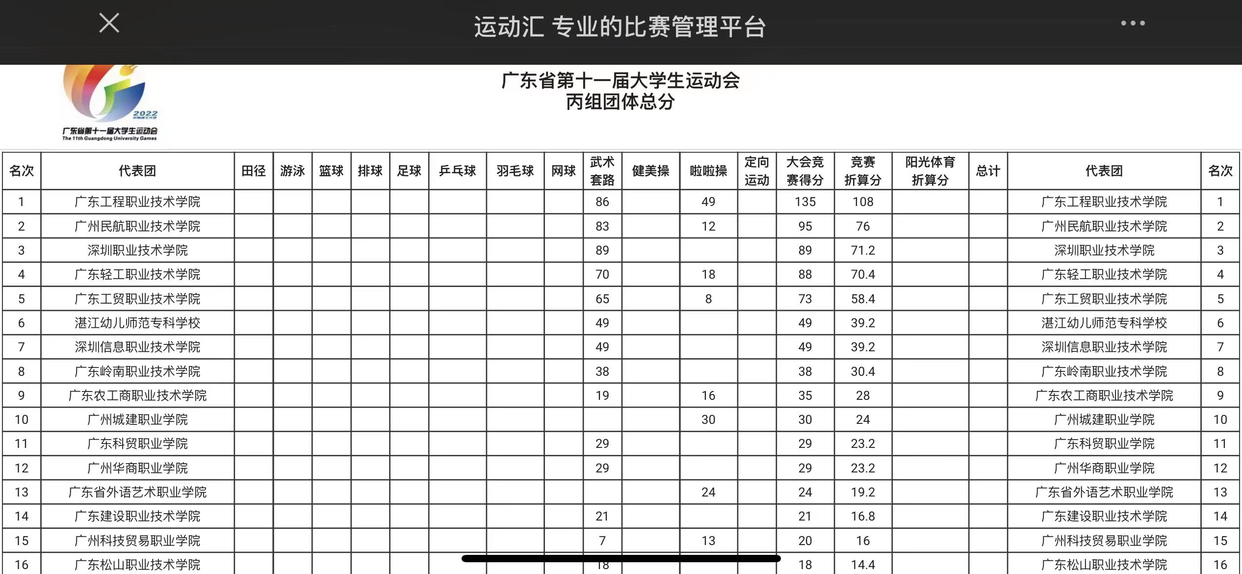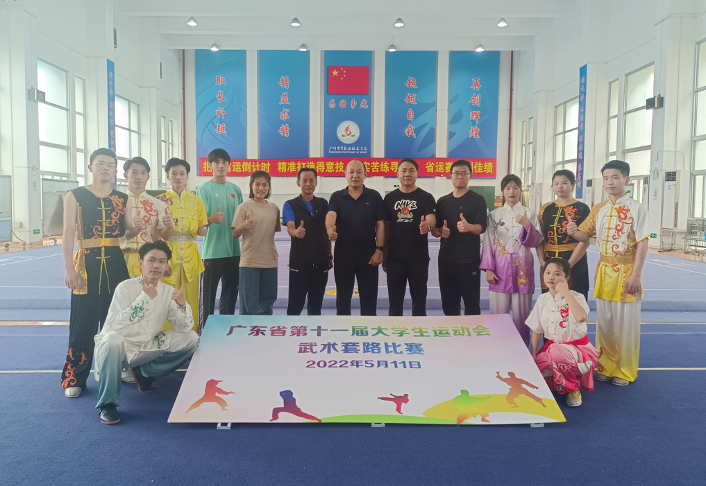 由广东省教育厅和广东省体育局联合主办的广东省第十一届大学生运动会武术套路比赛于2022年5月16日至20日举行。比赛采用各参赛队伍提交参赛视频+现场直播评比打分的形式。在学校领导的关心和生产实训中心物资采购后勤保障的大力支持下,方永文和刘上郭子两位老师为教练员带领武术队经过几个月的刻苦训练和认真筹备,圆满完成此次大运会武术套路比赛任务,并取得男子丙组自选刀术第一名、男子丙组自选长拳第一名、女子丙组自选太极剑第一名、女子丙组自选剑术第一名、男子丙组自选太极剑第二名、男子丙组自选棍术第二名、男子丙组自选南刀第二名、女子丙组自选刀术第二名、女子丙组自选长拳第三名、女子丙组自选南棍第四名、男子丙组自选长拳第五名、女子丙组自选南拳第六名、男子丙组自选南拳第七名、女子丙组自选长拳第七名的优异成绩。刘上郭子老师荣获“体育道德风尚奖”。