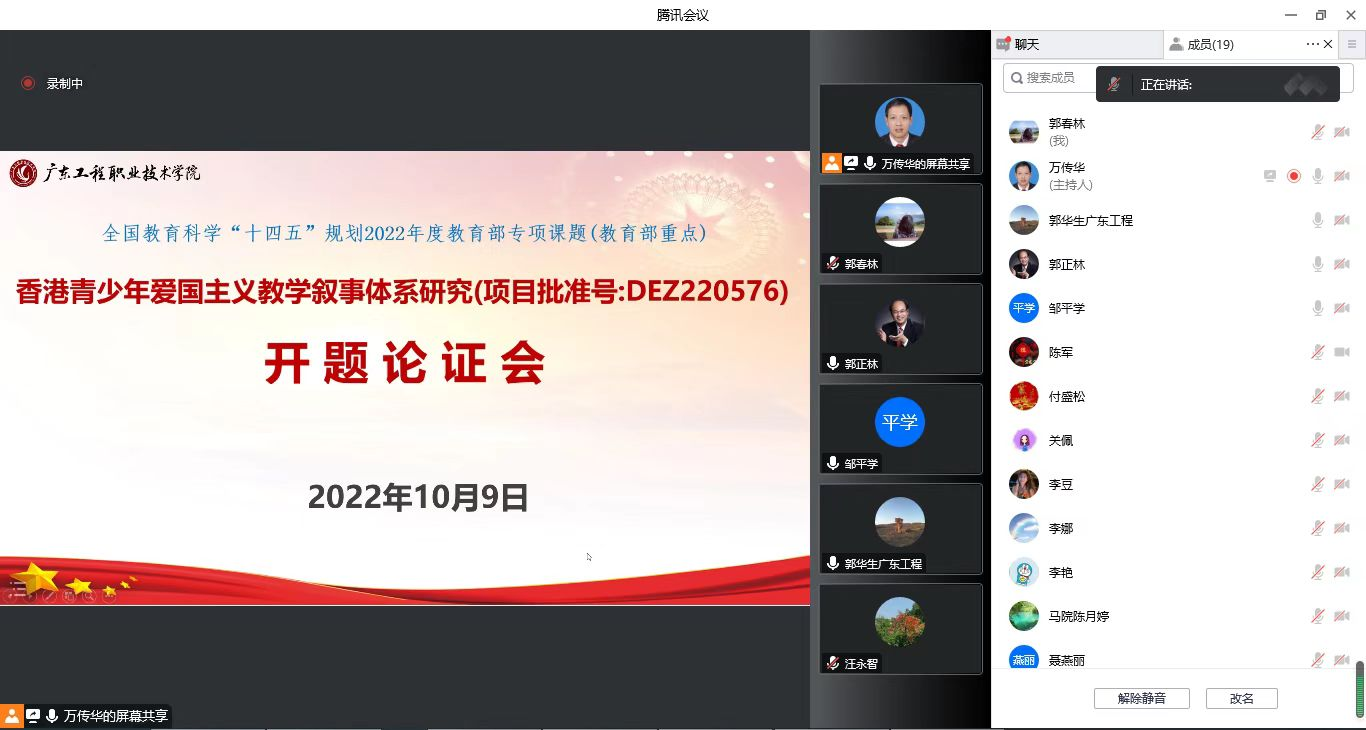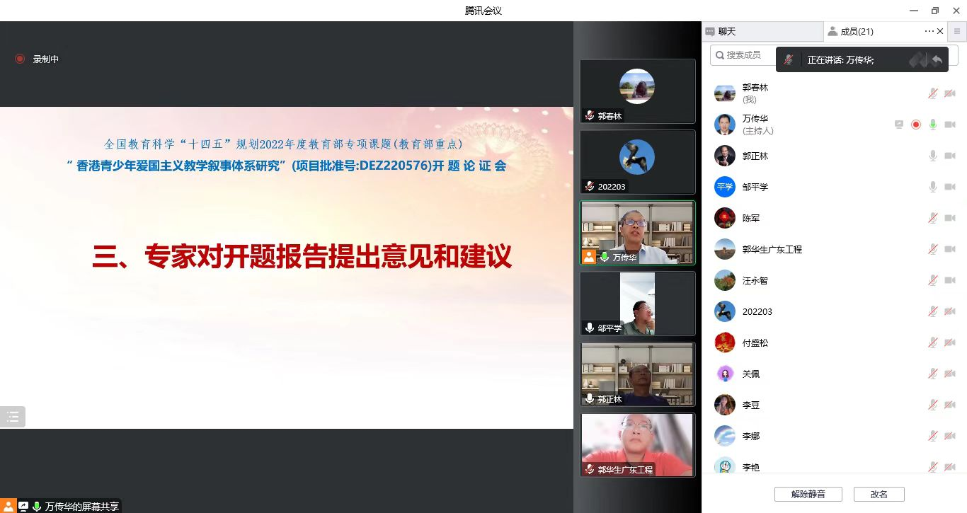 2022年10月9日,马克思主义学院万传华副教授主持的全国教育科学“十四五”规划2022年度教育部专项课题(教育部重点)《香港青少年爱国主义教学叙事体系研究》开题论证会在云端顺利举行。