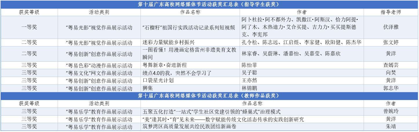 近期,广东省教育厅先后公布2025年“立志・修身・博学・报国”主题教育系列活动、第十届广东高校网络媒体展示节活动和2025年度广东省学生资助典型名单的评选结果。我校师生表现突出,共荣获23项荣誉,包括1项集体奖、2项个人一等奖、3项个人二等奖等,覆盖思政微课、实践纪实、新媒体创作、资助育人等多个领域,充分展现了我校学工队伍在思想引领和实践育人方面的扎实成效。