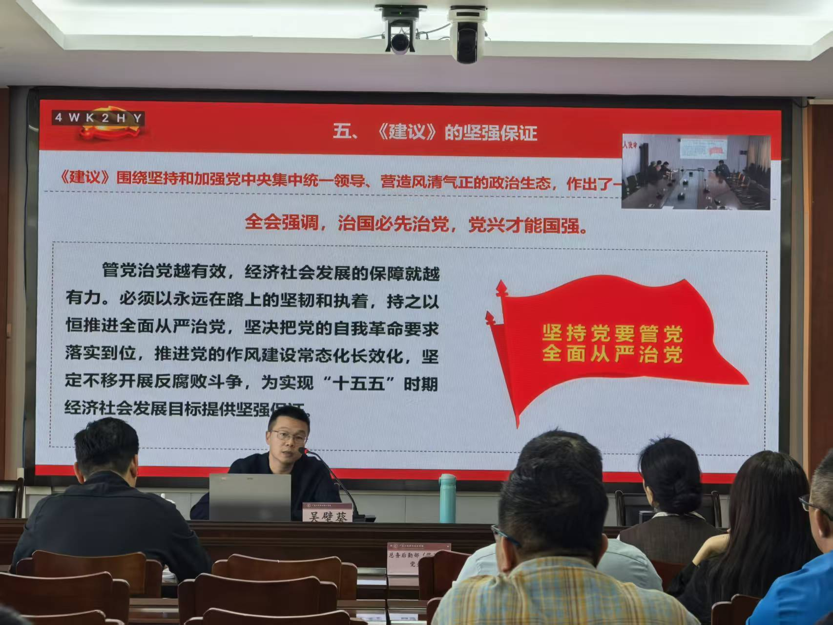 12月9日下午,学校党委委员、副校长吴志敏为科学技术部党支部、教学质量与监测中心党支部、体育健康学院教师第二党支部全体党员讲授党的二十届四中全会精神专题党课。会议首先落实“第一议题”制度,由主持人科学技术部党支部书记莫康信领学习近平总书记在广东考察时的重要讲话精神。随后,吴志敏副校长回顾了党的历届四中全会的发展历程,梳理了“十四五”时期我国经济社会发展取得的历史性成就,重点阐释了《中共中央关于制定国民经济和社会发展第十五个五年规划的建议》的指导思想、重大原则、主要目标和战略任务。在结合学校办学实际与发展使命的前提下,他指出,学校的职业教育必须深度融入广东省的发展大势与现代化产业体系建设。面对产业转型趋势,学校必须动态优化专业设置,深化产教融合,通过校企共建、定制化培养等路径实现教育与产业的精准对接。在人工智能快速发展的时代,教育者更应着眼于培养学生的创新思维、批判性思维等核心能力,要提升战略眼光,明确发展方向,将个人发展融入学校“十五五”规划蓝图,积极投身于省域“双高校”建设与“建高升本”核心目标。