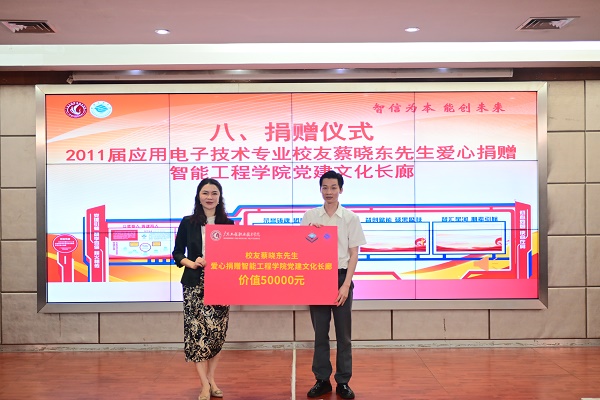 捐赠仪式上,2011 届应用电子技术专业校友、广州景颐光电科技有限公司创始人蔡晓东向学院党建文化长廊进行爱心捐赠,用实际行动诠释校友反哺母校的深厚情怀。仪式期间,文艺表演精彩纷呈:2024 级计算机应用技术专业学生谢家豪带来独唱《匆匆那年》,用悠扬歌声致敬青春韶华;智能工程学院“智心”艺术团带来舞蹈《我的未来式》,以朝气蓬勃的舞姿展现了新时代高职生昂扬向上、逐梦前行的精神风貌。