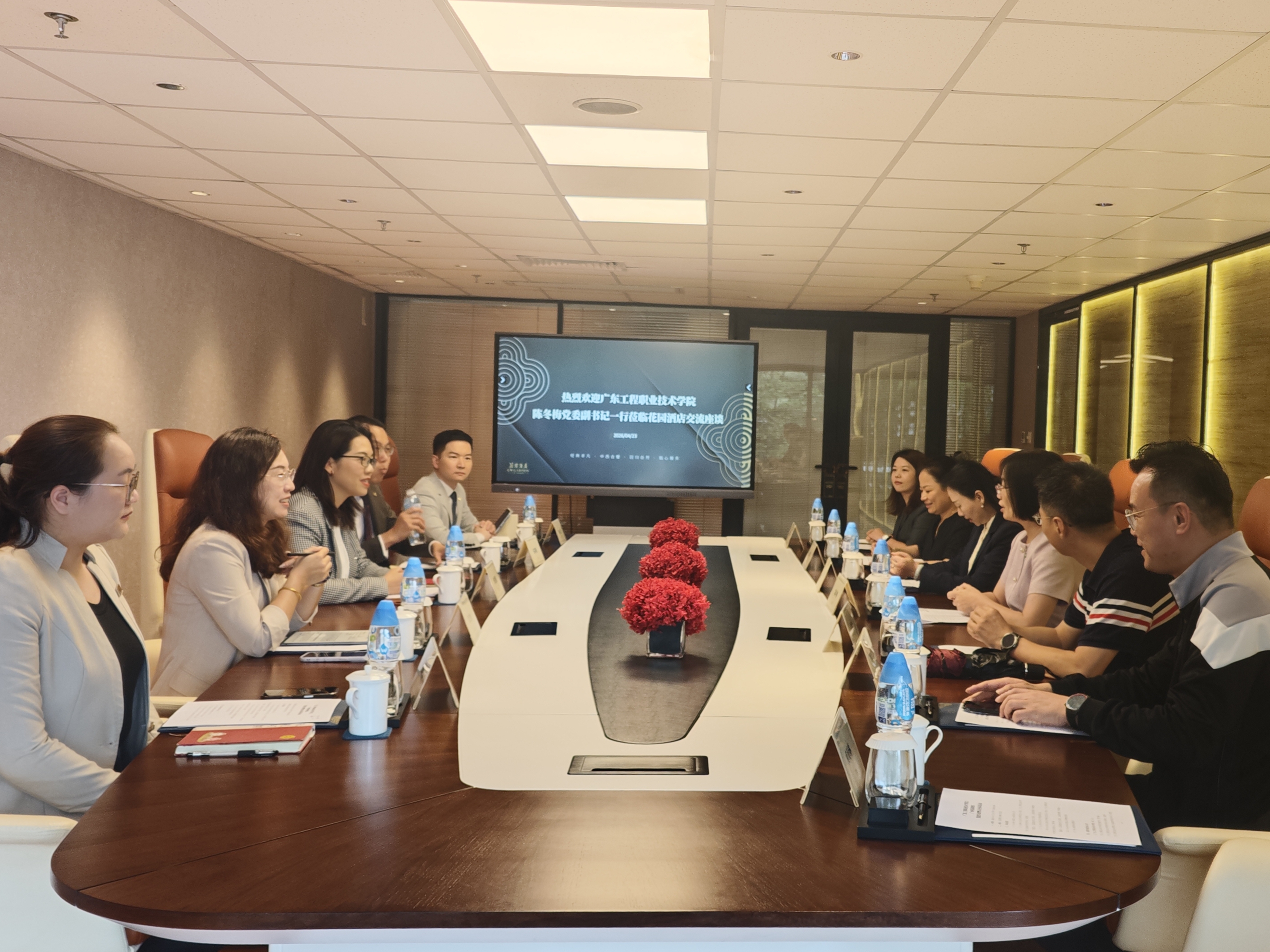 为深入贯彻落实新时代党的建设总要求,积极探索 “党建+校企合作”融合发展新模式,4月23日下午,学校党委副书记陈冬梅率队赴广州花园酒店,开展党建共建暨访企拓岗活动。科学技术部部长麦晓冬,文化旅游学院党委书记桂爱民、院长吴海彬、副院长伍燕青等参加了活动。广州花园酒店党总支委员、总经理助理邹倩雅,党总支委员、人力资源总监兼事务总监高嘉俊,第一党支部书记、党群工作部部长兼工会副主席黄文娟,职业发展经理彭祥安,人事经理张艳红等热情接待了校方一行。