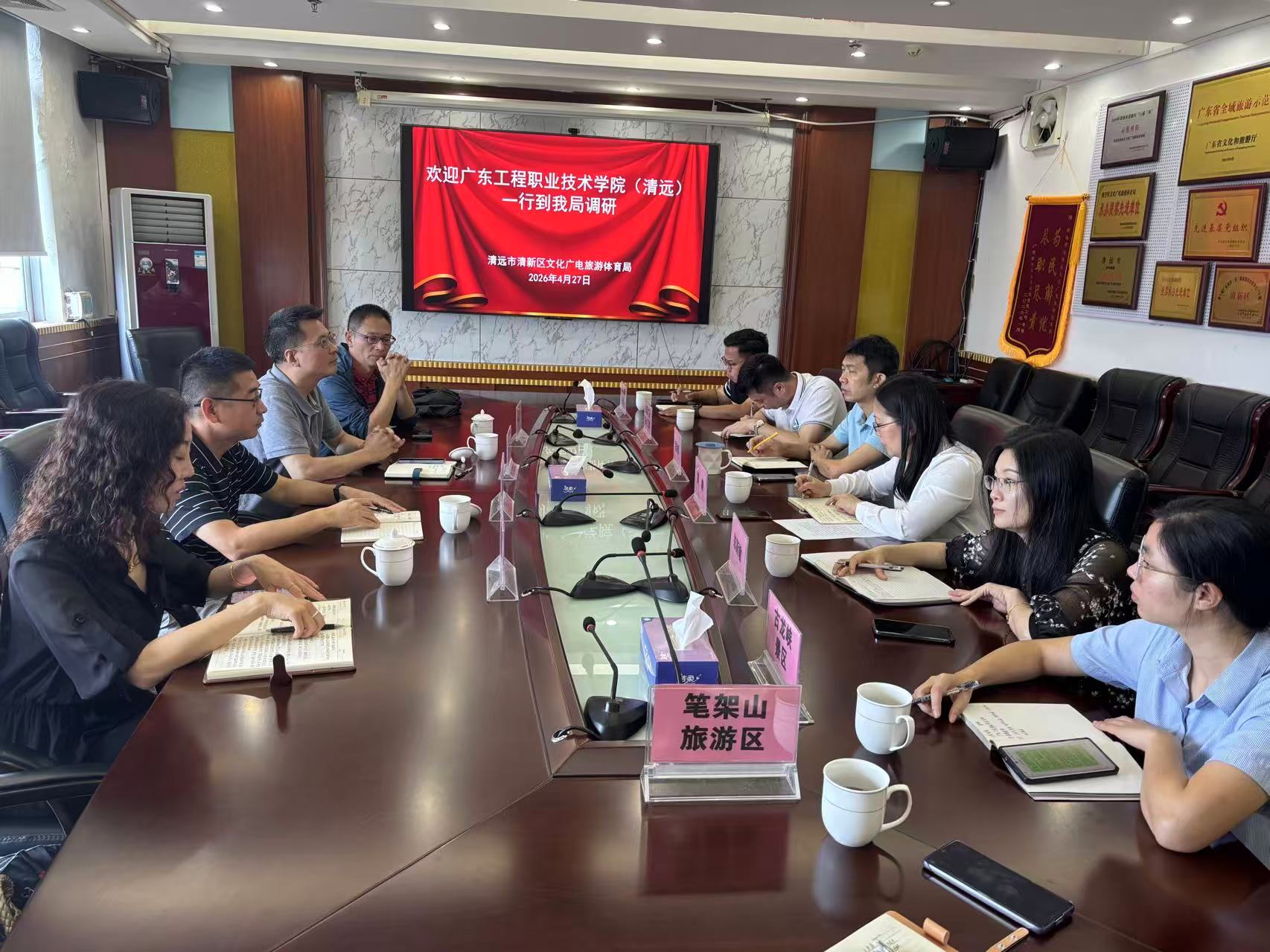 为深入贯彻产教融合、科教融汇发展理念,精准对接地方文旅产业与区域经济高质量发展需求,进一步拓宽学生实习就业渠道,2026年4月27日上午,我校科学技术部联合建筑工程学院、文化旅游学院、财经商贸学院一行,赴清远市清新区文化广电旅游体育局开展校政企调研座谈会。科学技术部副部长李跃辉、建筑工程学院院长王洪波、文化旅游学院院长吴海彬、财经商贸学院副院长丁慧鸽参加调研交流。