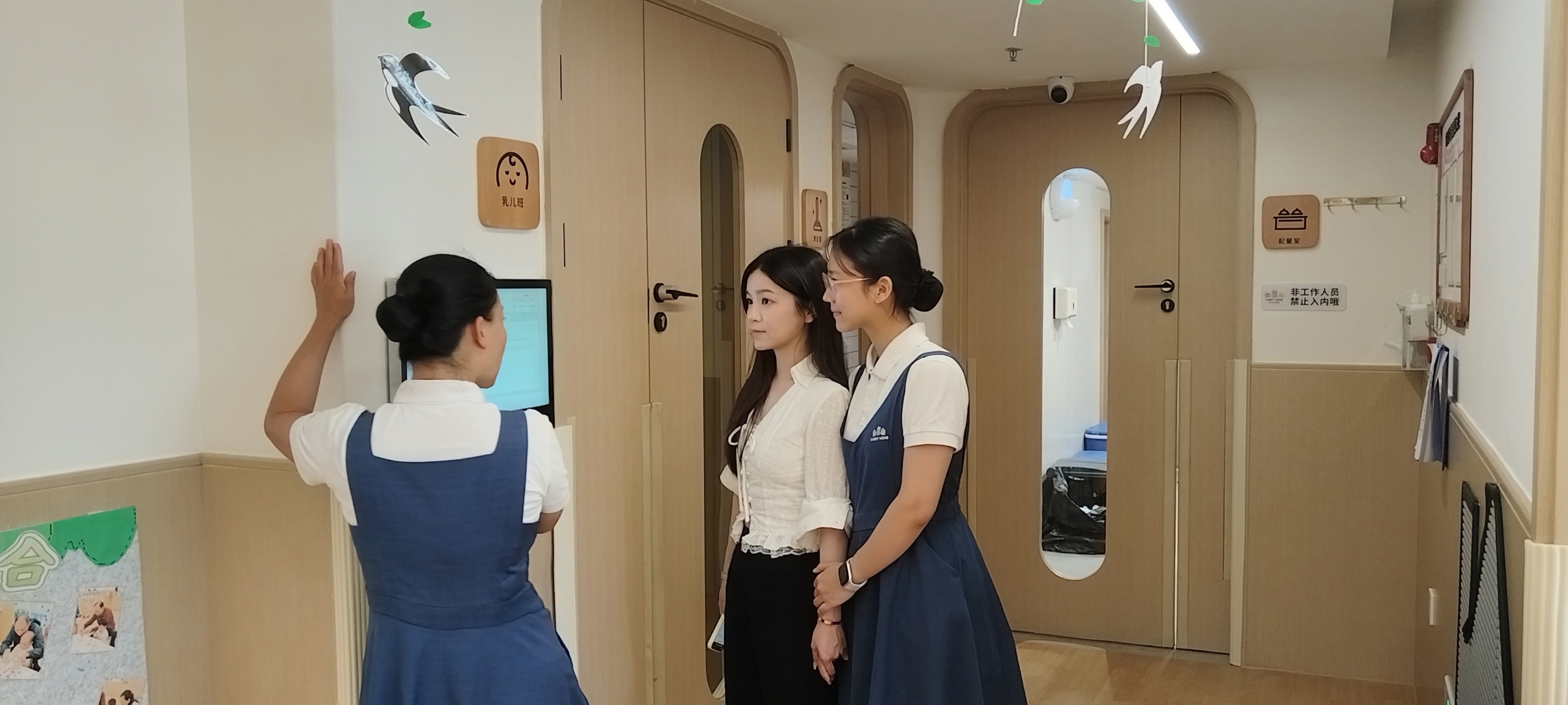 随后,杨润蕾一行实地考察了深业托育旗下的深铁懿府托育园,详细了解托育园的硬件设施、人员配置、托位规模、收费标准、日常管理、食品安全及消防设施等情况。与此同时,参访团还回访了在该园就业的学院毕业生,了解其工作适应情况、职业发展及岗位履职情况,带去学院的暖心关怀与殷切期望。