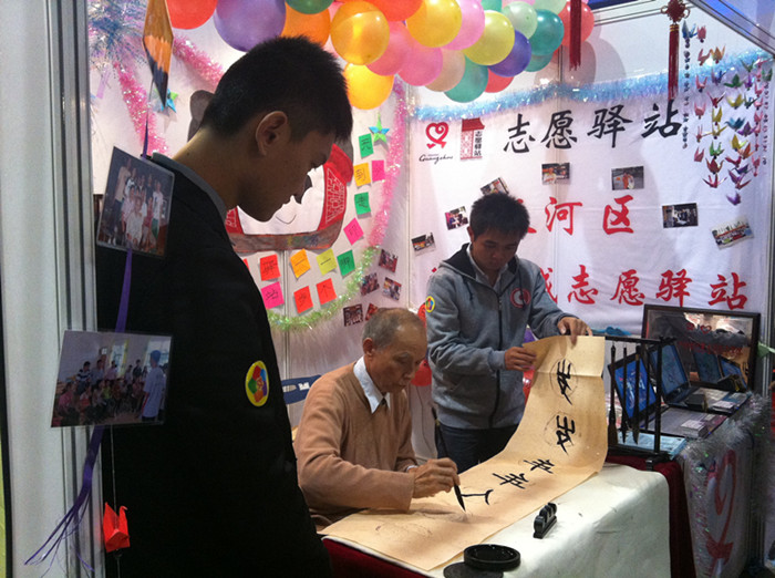 书法协会在展示期间吸引了一位老年志愿者现场挥毫