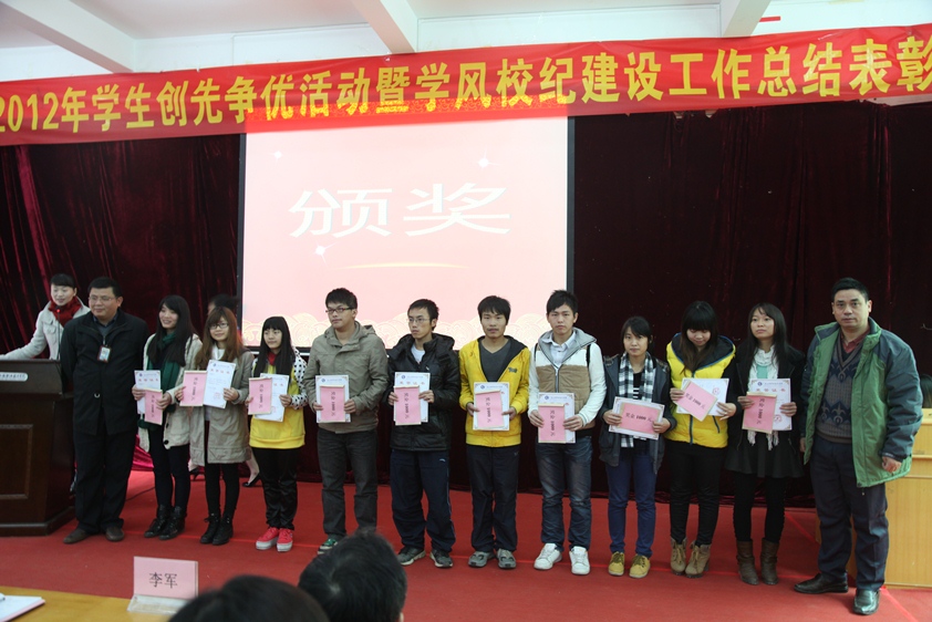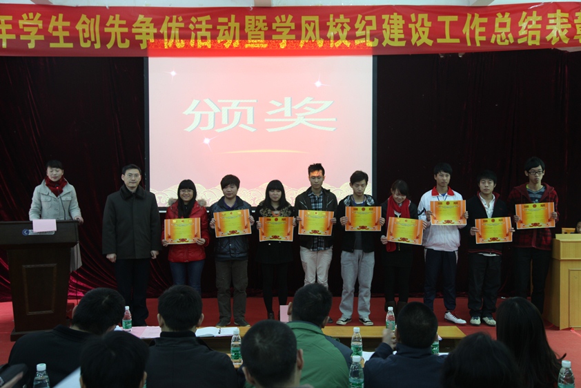 张华部长在会上宣读了《关于2012年学院学生"创先争优"评选活动先进集体和优秀个人的表彰决定 》和《关于表彰2012年学风校纪建设优秀班集体和个人的决定》。对在学风校纪建设活动中和学生"创先争优"活动中表现优异的20个"学风校纪建设优秀班集体"、20名"自律自强之星"、90名"自律之星"、和"十佳主题团日"以及"十佳优秀大学生"等先进集体和个人授予荣誉称号。
