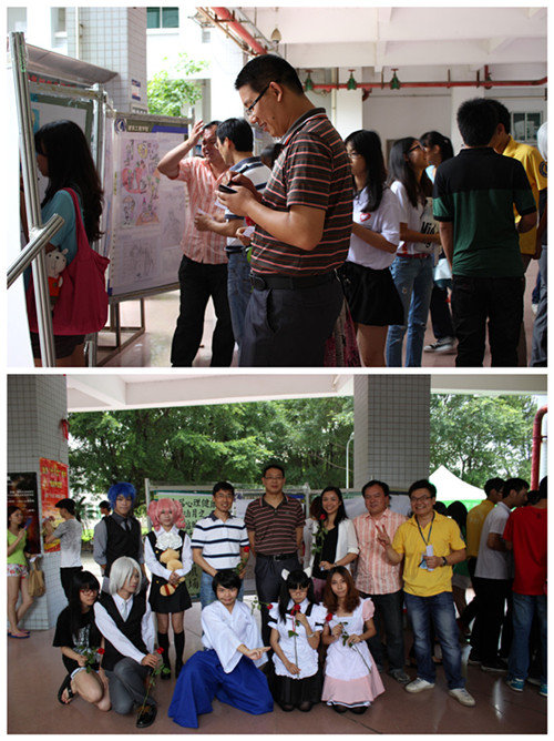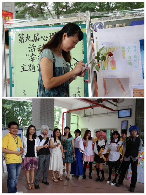 在作品展示现场,喜闻乐见的动漫设计作品展和动漫cosplay俏皮的真人秀,将心理健康和个性发展合二为一,吸引师生驻足欣赏。师生们在漫画作品前流连忘返、细细品味其中的"幸福",并为感动自己的"幸福瞬间"投下神圣的一票。学生工作部桂爱民副部长、张永强科长,建筑工程学院学工队伍的全体成员等莅临投票现场,将本次活动推向高潮。
