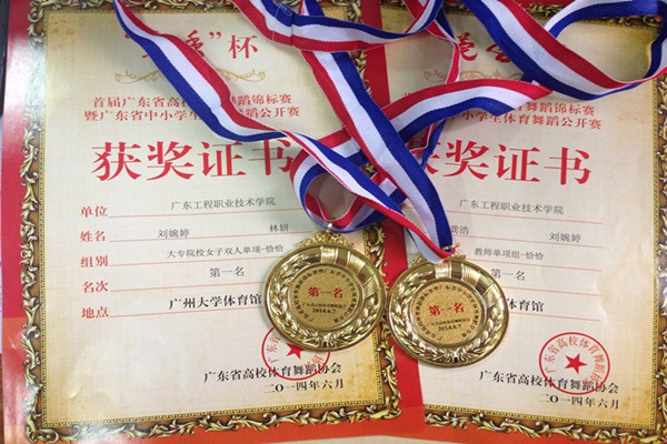 "莞香杯"首届广东省高校体育舞蹈锦标赛暨广东省中小学生体育舞蹈公开赛6月7日在广州大学城广州大学体育馆隆重开赛,来自广东全省67支代表队2000多名选手们在赛场上一展舞技和激情。体育舞蹈舞姿妩媚薄酒、热情奔放、节奏感强,是一项将舞蹈艺术和体育运动完美融合于一身的艺术形式,兼具了文化娱乐和体育竞技的双重内涵。本次比赛不但项目多,参与者多,普及和提高相结合,吸收多元文化精华,竞争程度空前激烈。首次参加体育舞蹈比赛的我院悦舞啦啦队队员刘婉婷、林研两位同学,参加了大专院校女子双人单项恰恰组和教师单项恰恰组,经过激烈的角逐,最终在两个组别中都赢得了第一名!这是我院体育舞蹈的发展路上一个新的里程碑!