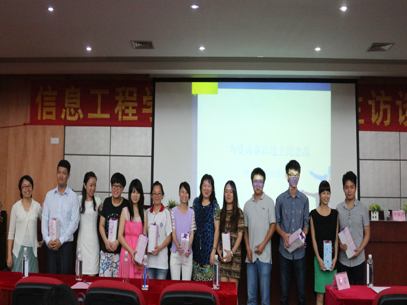 为促进在校生与毕业生之间交流,帮助其合理规划大学生活,提升就业观念,2014年6月13日晚上七点半,信息工程学院2014届毕业生访谈会在图书馆一楼学术报告厅隆重举行。本次访谈会邀请了国家奖学金代表陈垲冰、优秀毕业生代表钟佩伦、优秀学生干部代表谢燕、考上广州美术学院优秀学生代表詹钰琪、优秀实习生代表魏仙花、党员代表曾春露等人作为访谈嘉宾,信息工程学院刘松梅书记、肖贵灯副书记、李碧方老师、刘娟老师、叶晓明老师及我院12、13级学生出席了本次访谈会。