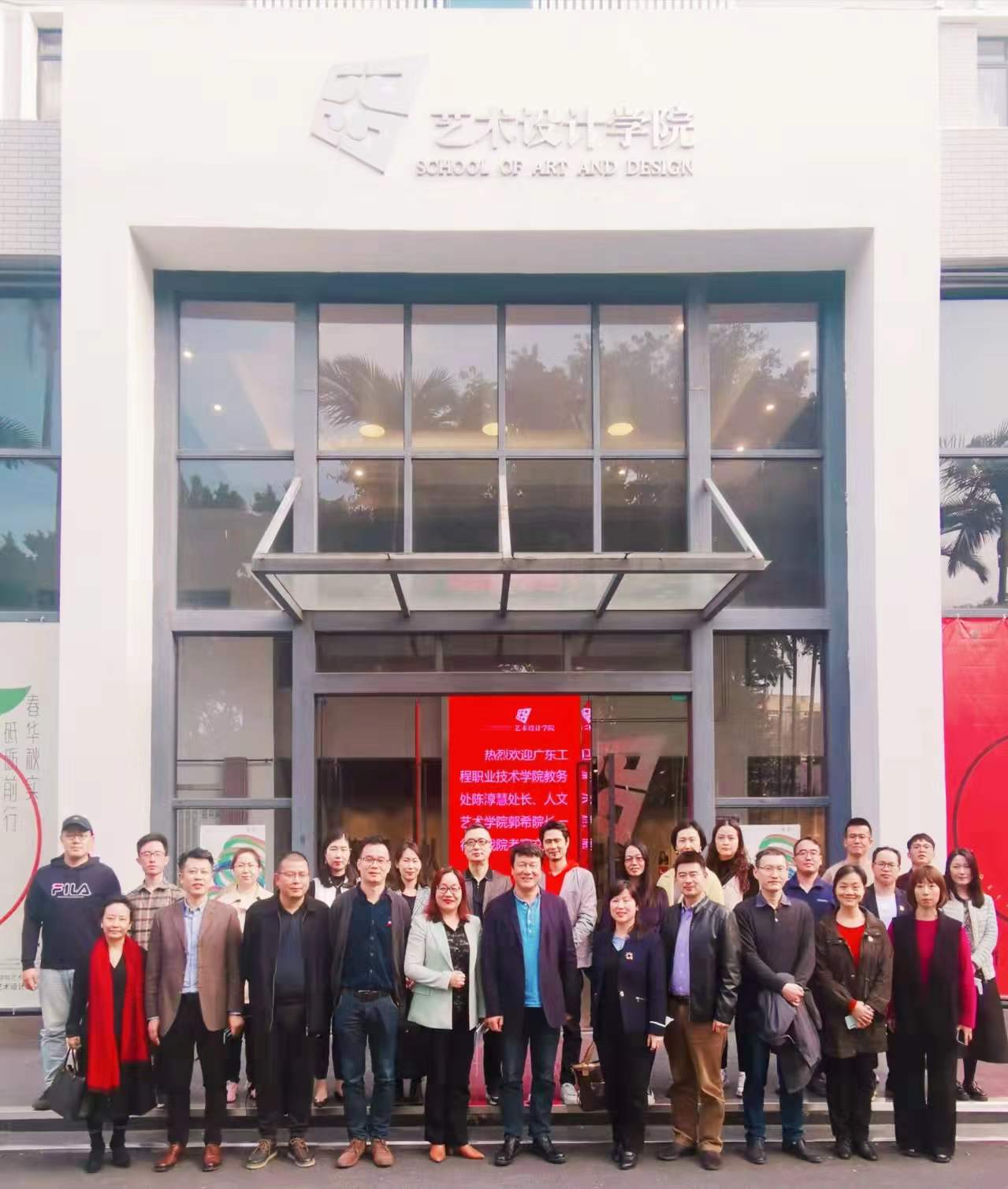 为进一步加强我院高水平专业群建设,2022年1月8日,广东工程职业技术学院教务处处长陈淳慧、教务处副处长陈国雄,人文艺术学院院长郭希、党总支书记张华、副院长施焦、党总支副书记焦英、专业群负责人尹一军以及专业群建设骨干教师团队一行,赴广东工程职业技术学院艺术设计学院就双高群建设工作考察学习,广东轻工职业技术学院校办主任张斌、艺术设计学院院长桂元龙、副书记陈丽英、副院长徐禹、副院长伏波、办公室主任张锡莹、环艺教研室主任陈加强等热情接待。