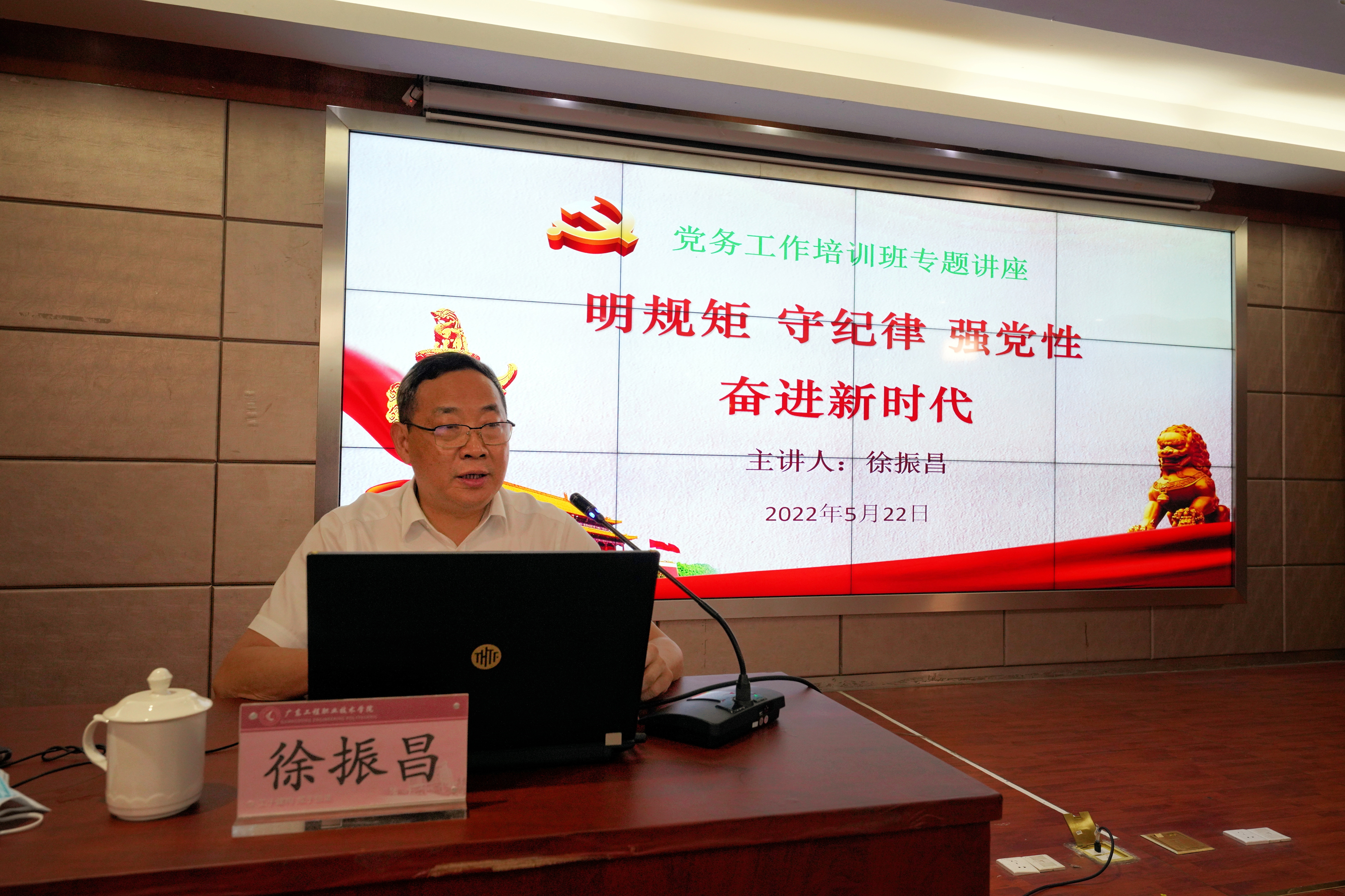 徐振昌在授课中对学校党务工作者提出三点要求:一是严明规矩,提升法纪意识。必须遵循党章这一总章程、总规矩,必须遵守党的纪律、国家法律,遵守在长期实践中形成优良传统和工作惯例。二是坚持道德高线,坚守纪律底线。严格落实中央八项规定精神,严明政治纪律、组织纪律、廉洁纪律、群众纪律、工作纪律、生活纪律。三是加强党性修养,当好新时代引领者。加强理论武装,坚定理想信念;遵守六大纪律,廉洁修身齐家;自觉履行职责,勇于担当作为;自觉接受监督,加强廉政建设。