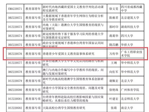 近日,全国教育科学规划领导小组办公室公布了全国教育科学“十四五”规划2022年度课题立项的评审结果。马克思主义学院万传华老师主持的《香港青少年爱国主义教育叙事体系研究》成功立项教育部专项课题(课题批准号:DEZ220576)。