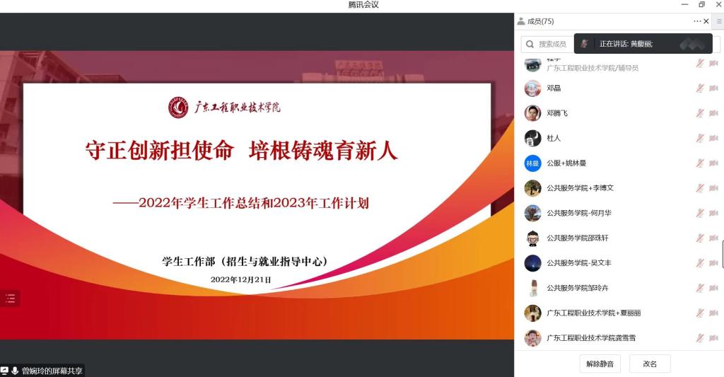12月21日上午,学生工作部(招生与就业指导中心)召开2022年学生工作总结交流会,学校副校长张小广出席会议并讲话,学生工作部(招生与就业指导中心)全体人员、各二级学院党总支副书记及全体辅导员参会,学生工作部部长黄馥丽主持会议。