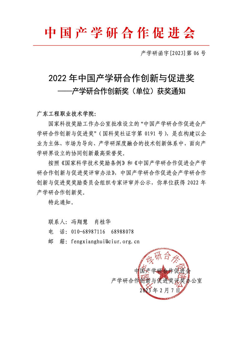 风帆更劲,奋楫前行!为推进学校高质量发展,开好局、起好步,发扬奋斗之志,我校荣获“2022年中国产学研合作创新与促进奖”。此奖项是在构建以企业为主体、市场为导向,产学研深度融合的技术创新体系中,面向产学研界设立的协同创新最高荣誉奖。该荣誉为助力我校“双高”建设任务再添一项标志性成果。