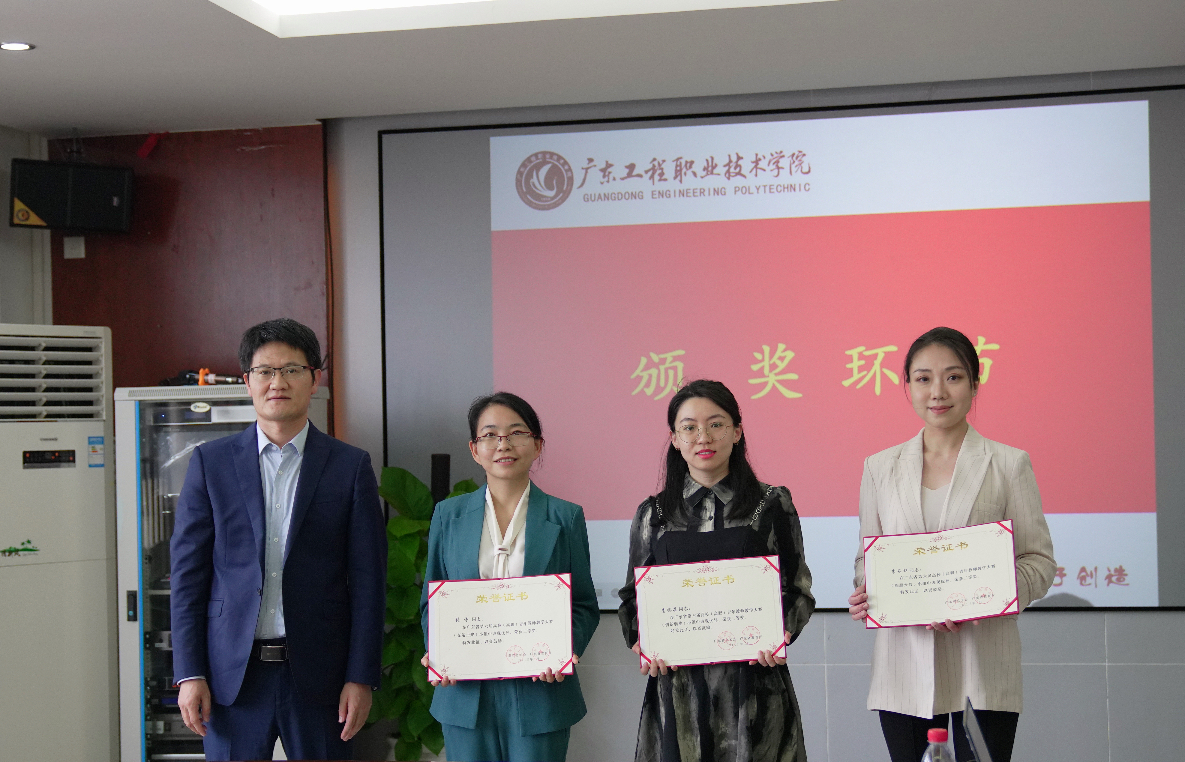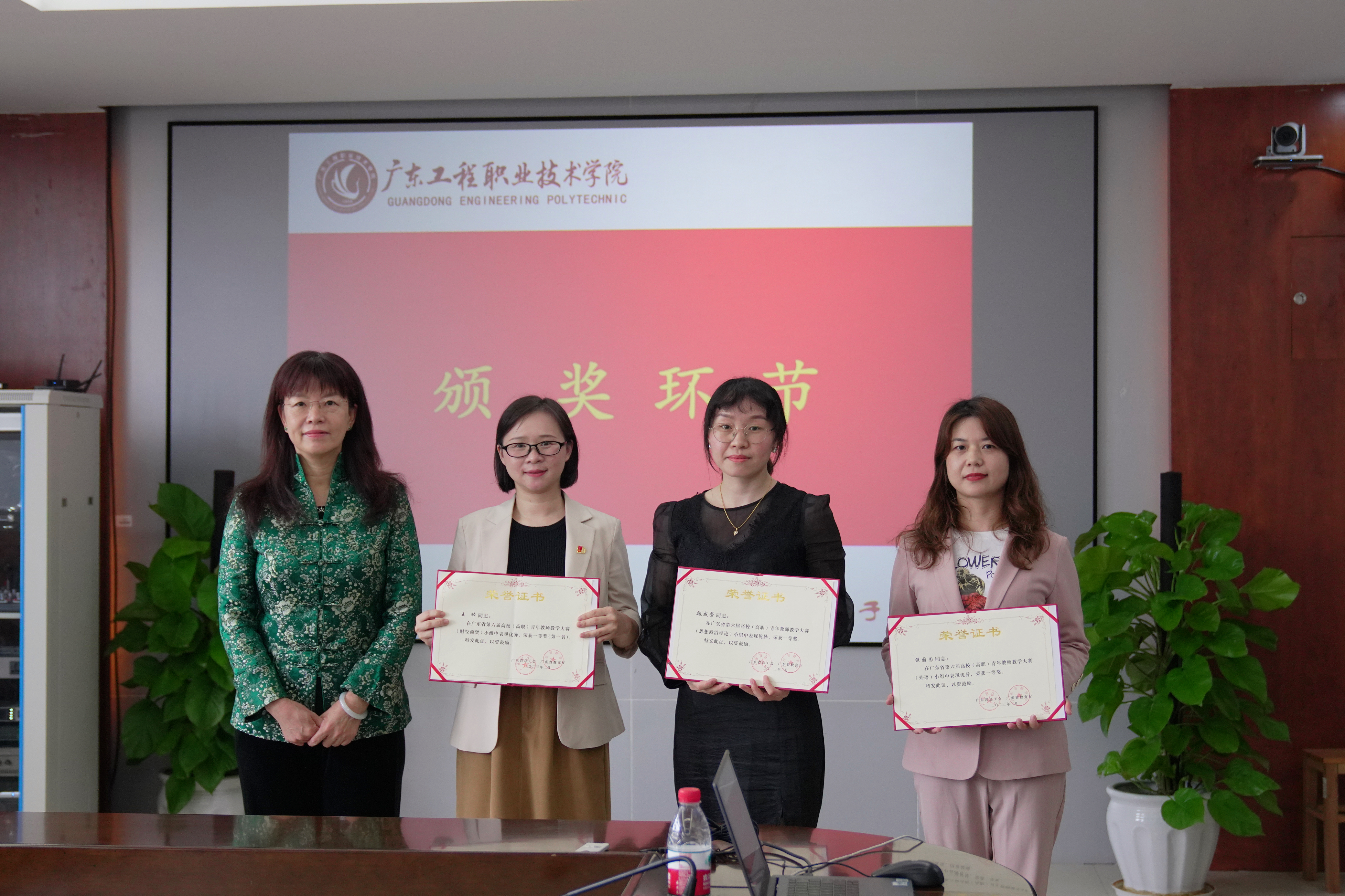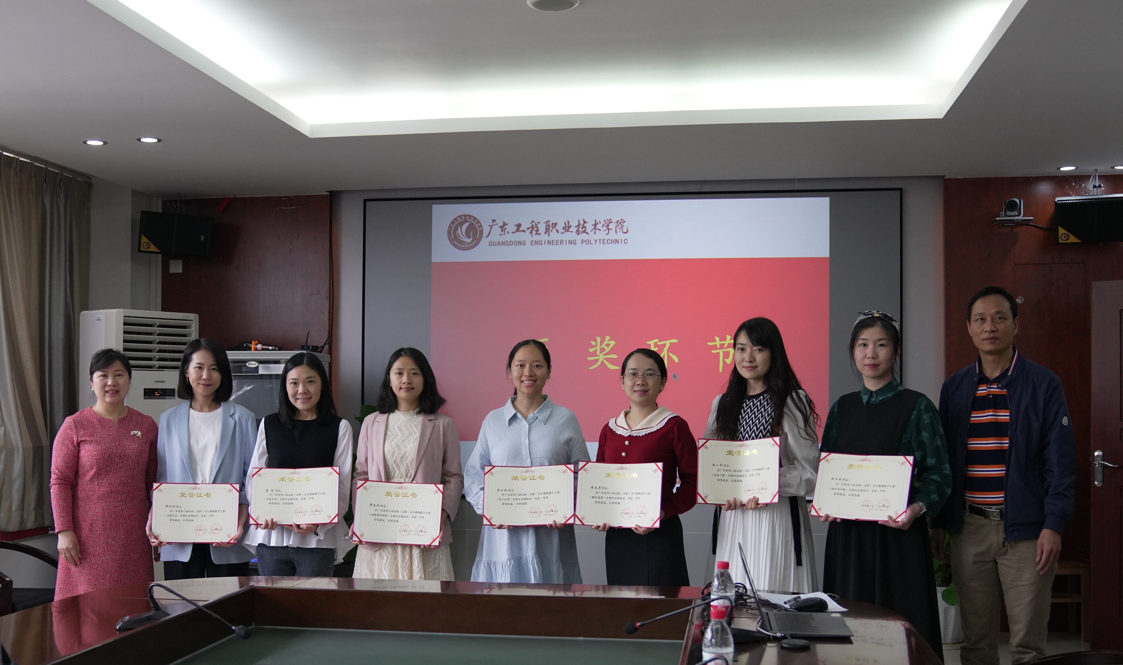 3月17日下午,广东工程职业技术学院举行参加广东省第六届高校(高职)青年教师教学大赛总结表彰会在广州校区办公楼615室举行。党委副书记、工会主席方燕,副校长吴志敏及教务部部长陈淳慧出席并为获奖教师颁奖。工会专职副主席钟向忠主持会议,各教学部门负责人和参赛教师参加了会议。