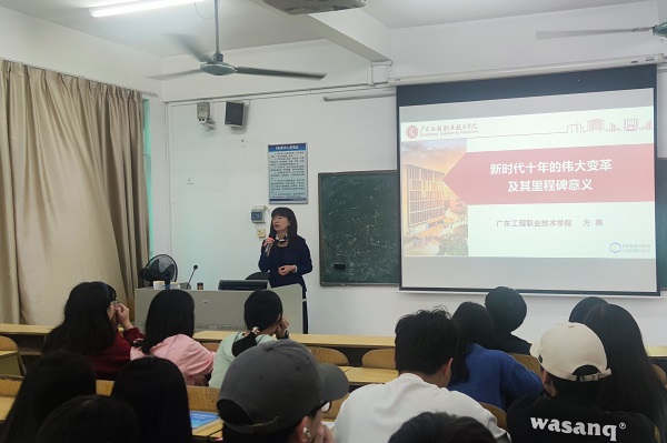 3月14日,学校党委副书记方燕教授在广州校区为2021级计算机网络技术C、D班的同学讲授了题为《新时代十年的伟大变革及其里程碑意义》的“思政第一课”。授课中,方燕副书记以丰富的材料、深入浅出的讲解,引导同学们从“新时代十年伟大变革”“新时代十年伟大变革的里程碑意义”“新时代十年伟大变革的根本原因”三个方面进行分析与阐述,剖析新时代中国取得的伟大成就,揭示新时代取得伟大成就的根本原因。方燕副书记的讲授,使同学们更深刻认识新时代的伟大成就,更加明确了如何践行“两个维护”,坚定“四个自信”,怀抱梦想又脚踏实地,敢想敢为又善作善成,立志做有理想、敢担当、能吃苦、肯奋斗的新时代好青年。