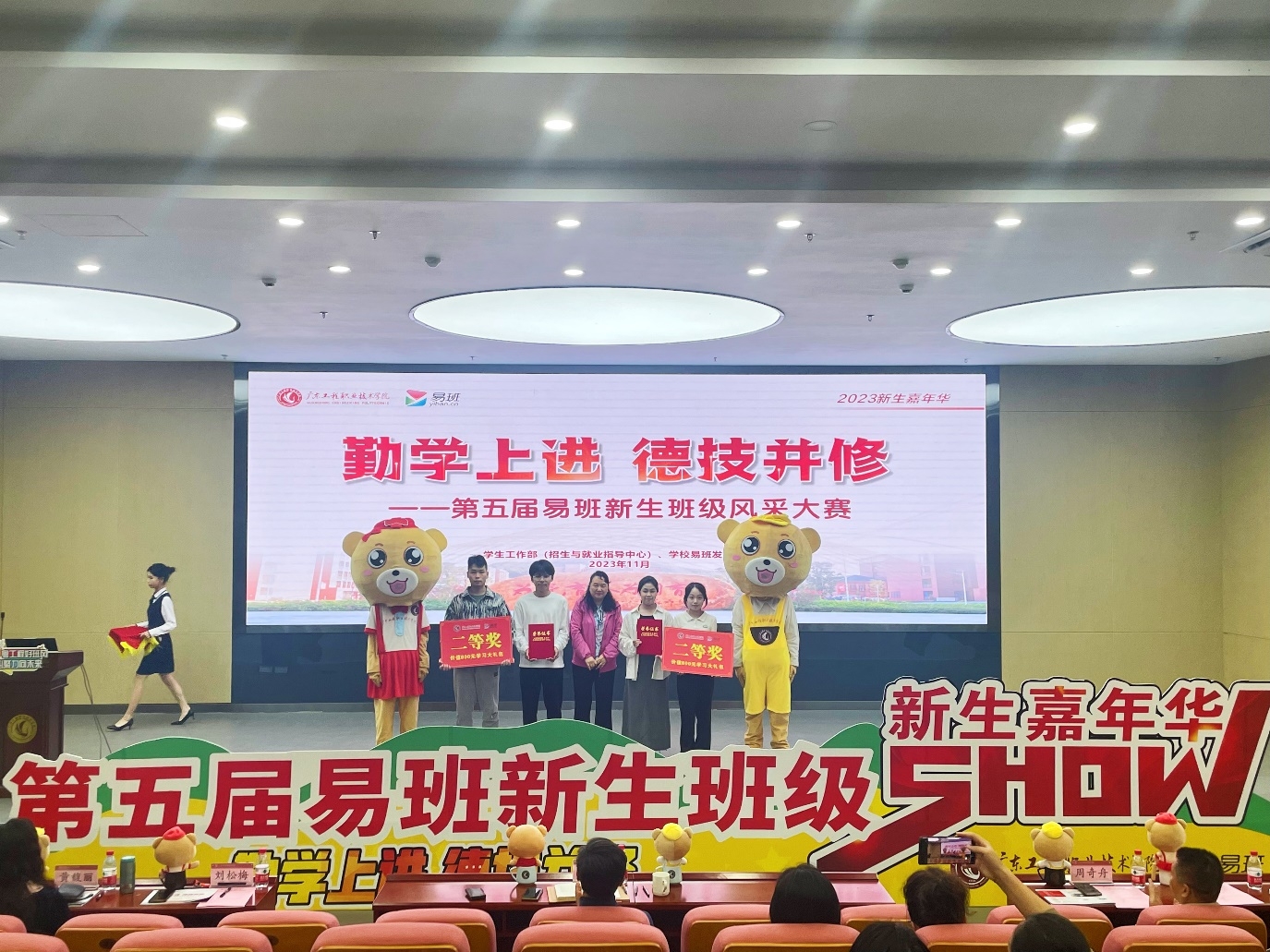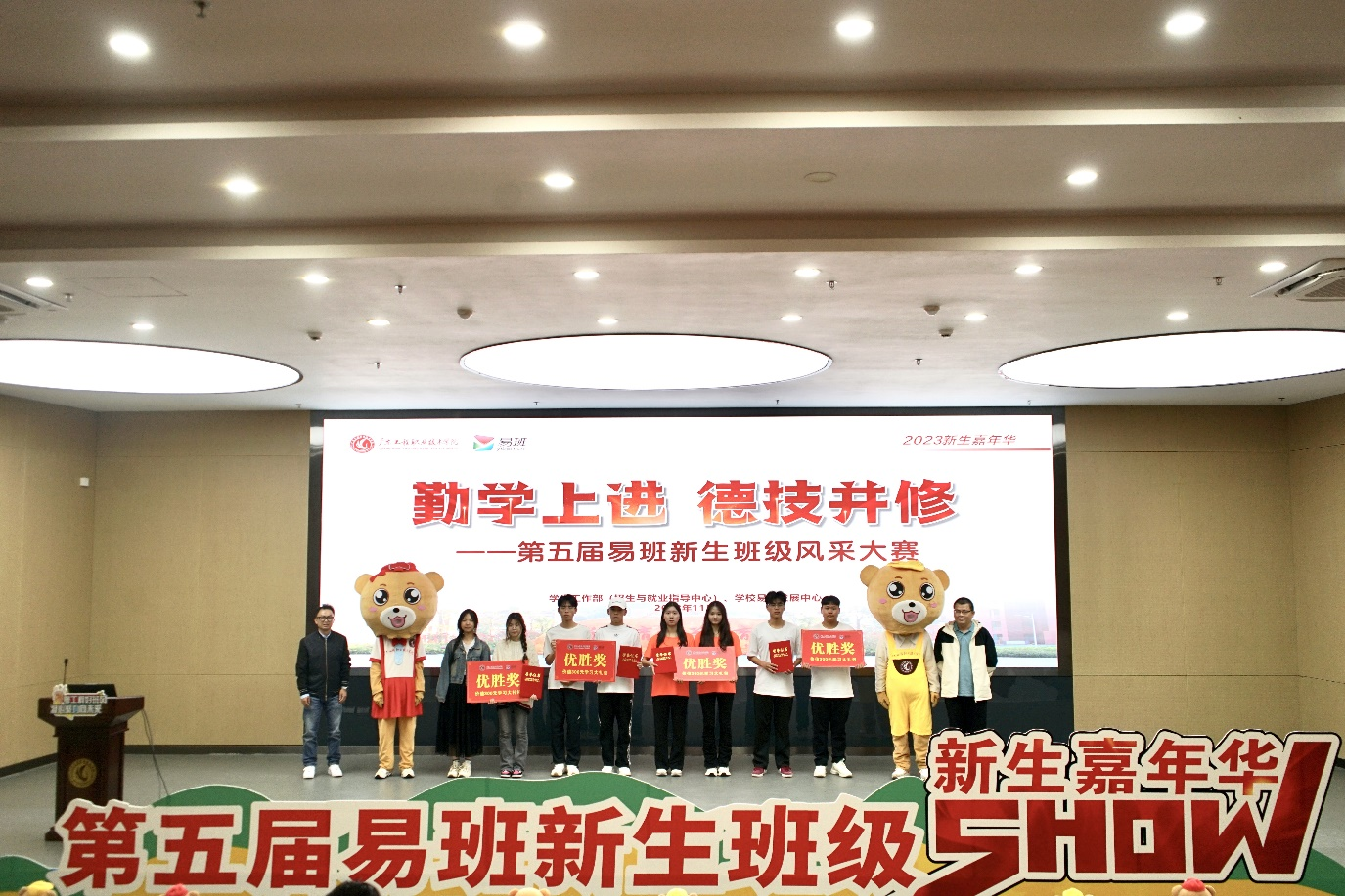副校长张小广为荣获本届易班新生班级风采大赛冠军信息工程学院2023级数字媒体技术A班颁奖。评委为获得二等奖、三等奖、优胜奖班级颁奖。