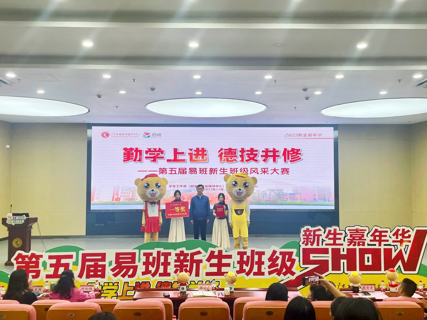 为进一步加强班级文化建设,充分发挥易班平台在学生思想政治教育和班级建设中的作用,打造具有“工程”特色的网络思政和班级文化建设品牌,11月29日,由学生工作部(招生与就业指导中心)主办、学校易班发展中心承办的第五届易班新生班级风采大赛决赛在清远校区办公楼一楼报告厅举行。学校副校长张小广出席并颁奖,各二级学院书记、副书记,学生工作部相关人员,清远校区全体辅导员,二级学院分站学生代表,所有参赛班级参加活动。组织统战部部长刘松梅、学生工作部部长黄馥丽、教务部副部长陈国雄、校团委副书记黄澄、学生工作部副部长曾婉玲担任决赛评审。