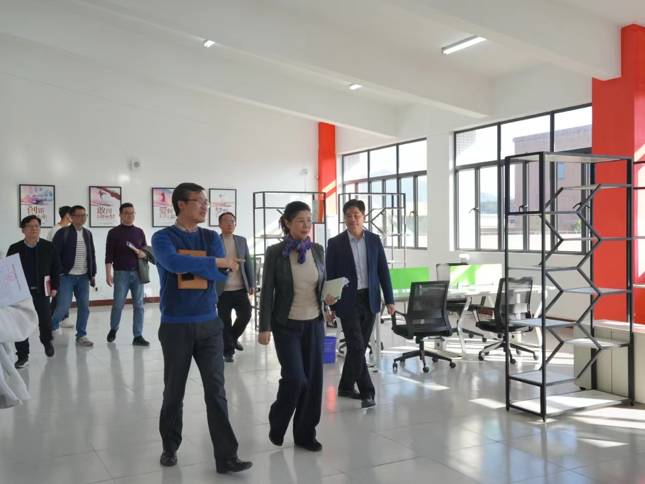 总结会议结束后,李丽校长、张小广副校长和与会人员一同前往校园大学生创新创业孵化基地参观,现场了解基地建设和大学生创业项目孵化运营情况。