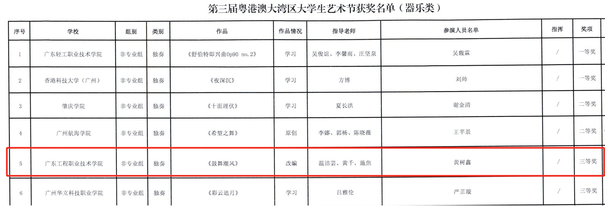 《勇敢的摘星人》《腾龙寰宇》《锦绣广州城市画卷》(指导老师:李瑛)获平面设计类专业组二等奖,《青春奔赴梦想,圆梦大湾区》(指导老师:徐谌榕)获平面设计类专业组三等奖,《鼓舞潮风》(指导老师:温洁芸、黄千、施焦)获器乐类非专业组三等奖。