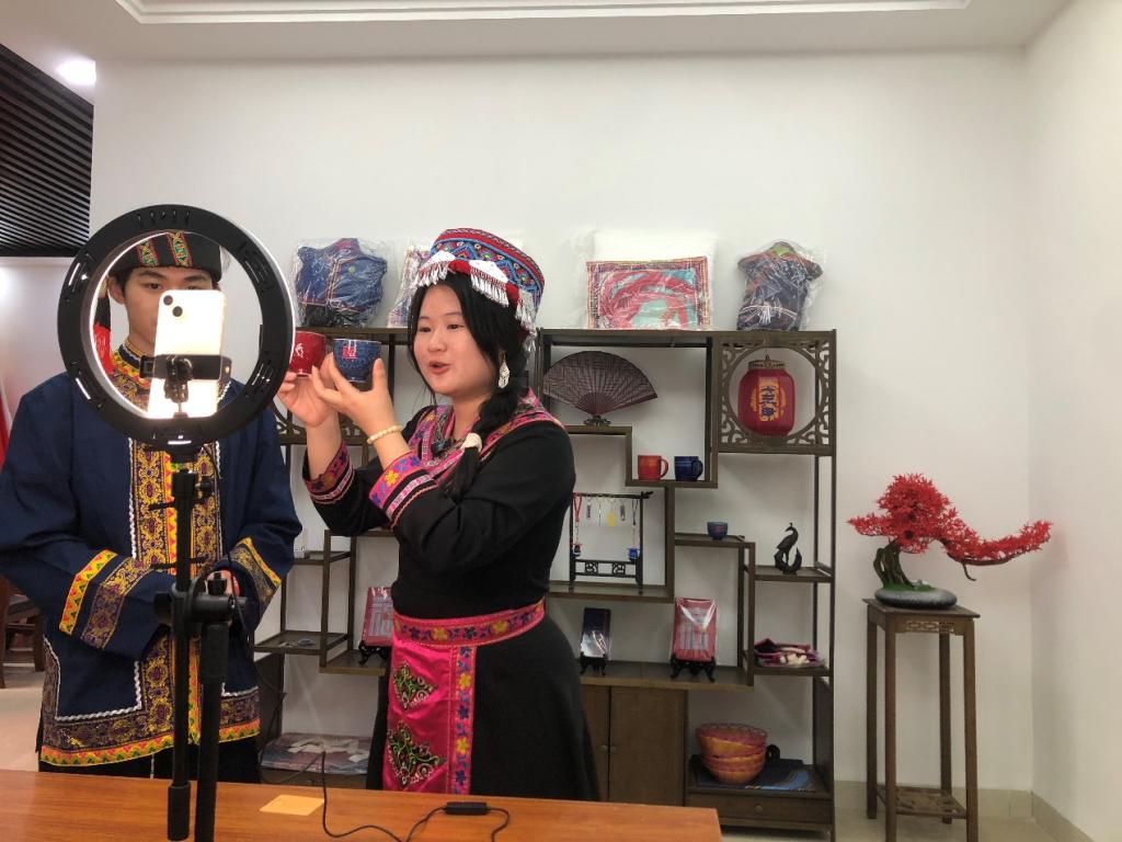 “采下霓虹编丝线,织成畲乡锦绣天,欢迎来到传畲乡千年文化,品畲族文创魅力直播间”。2024年2月29日下午1点,两位穿着畲族民族服装的电子商务学生,正在抖音直播间开展畲族民俗产品的带货直播,通过畲族彩带、畲族特色文创产品的直播销售,传递七彩畲情,传播畲乡物语,传承非遗文化。长达两小时的直播获3万+点赞,上千条互动,官方数据显示流量及互动超过同期86.65%的直播间,吸引一批粉丝踊跃下单,同时引起饶洋镇政府的广泛关注,受邀前往周边村庄开展特色直播。