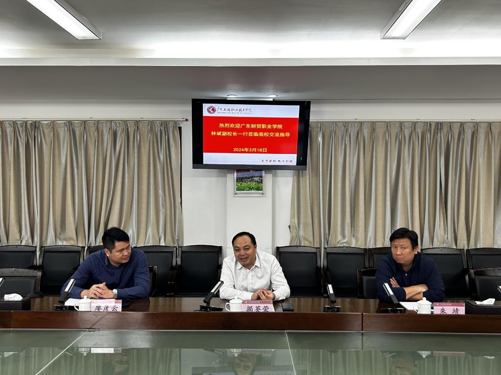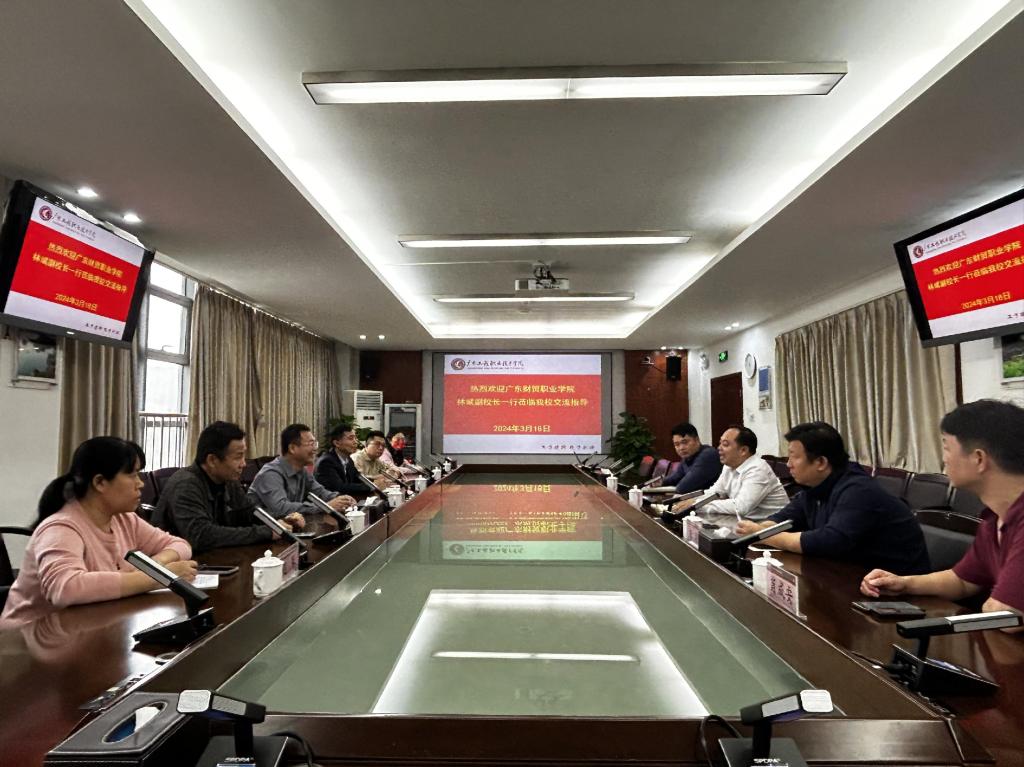 3月18日上午,广东财贸职业学院林斌副校长一行到我校开展调研交流,座谈会在广州校区 615 会议室召开。学校揭英荣副校长出席交流会,资产设备部部长朱靖、总务后勤部(保卫部)负责人廖彦云等参加座谈会。座谈会由揭英荣主持