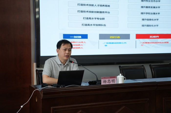 杨忠明教授以《双高计划高水平专业群建设绩效评价及实践路径的思考》为题,紧紧围绕“双高计划高水平专业群”的建设要求、完成情况、经验成效、特色亮点和未来方向五个方面,深入浅出地为我校推进“双高建设”提供了思路、指明了方向。