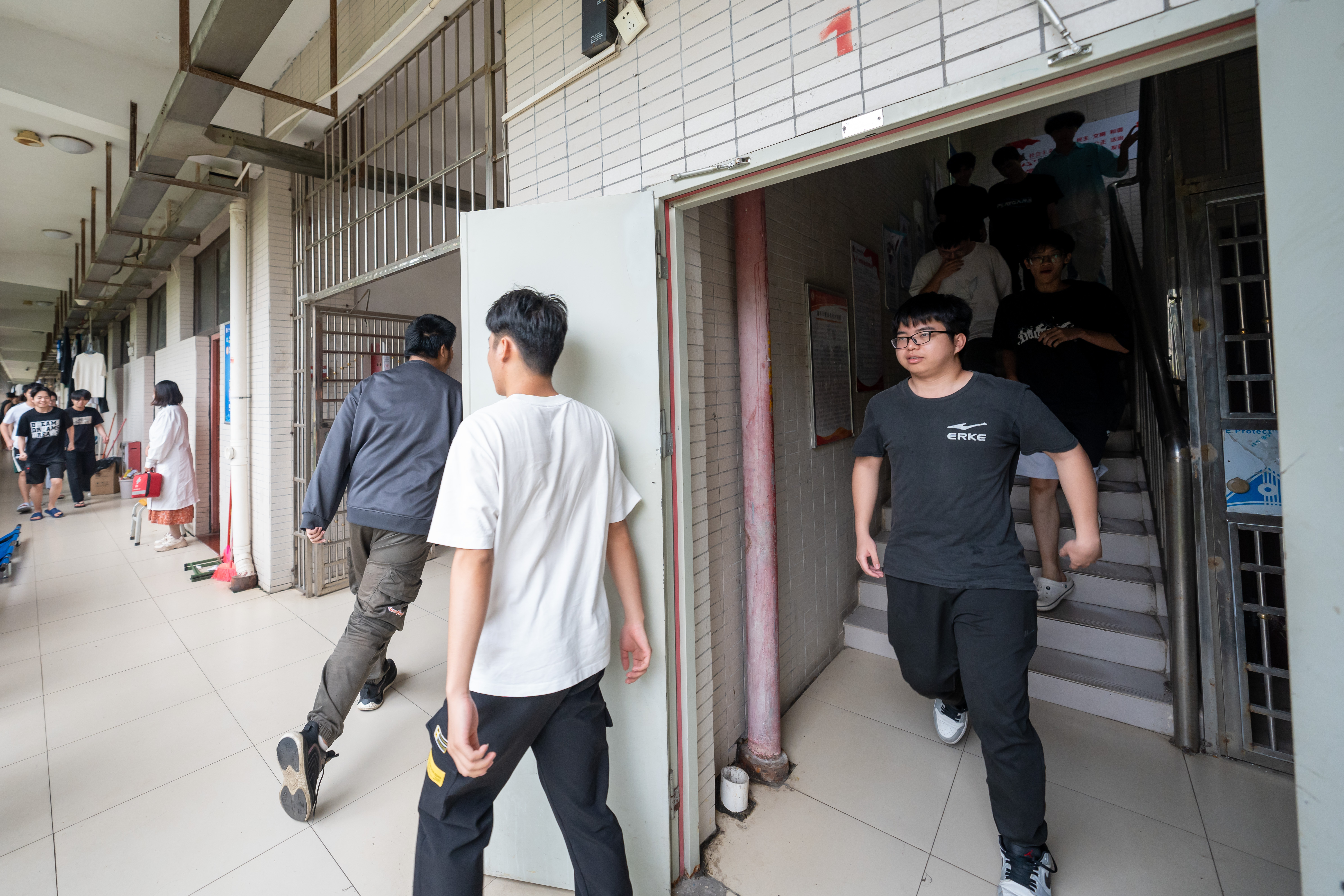 本次演练活动模拟学生宿舍突发火警,学生紧急疏散到安全区域。下午4:00,现场指挥汇报准备就绪,校领导下达“演练开始”指令,随即警报响起。宿舍管理员立即打开所有应急消防通道门,保安、义警队员在各楼层、道路引导学生按路线疏散。各栋宿舍内的学生俯身低头、手捂口鼻,快速、有序疏散撤离火灾现场。4:04分,所有参与演练的学生成功疏散到安全区域;4:15分,所有工作人员及参与演练的学生到操场集合完毕,火灾疏散逃生演练圆满完成。