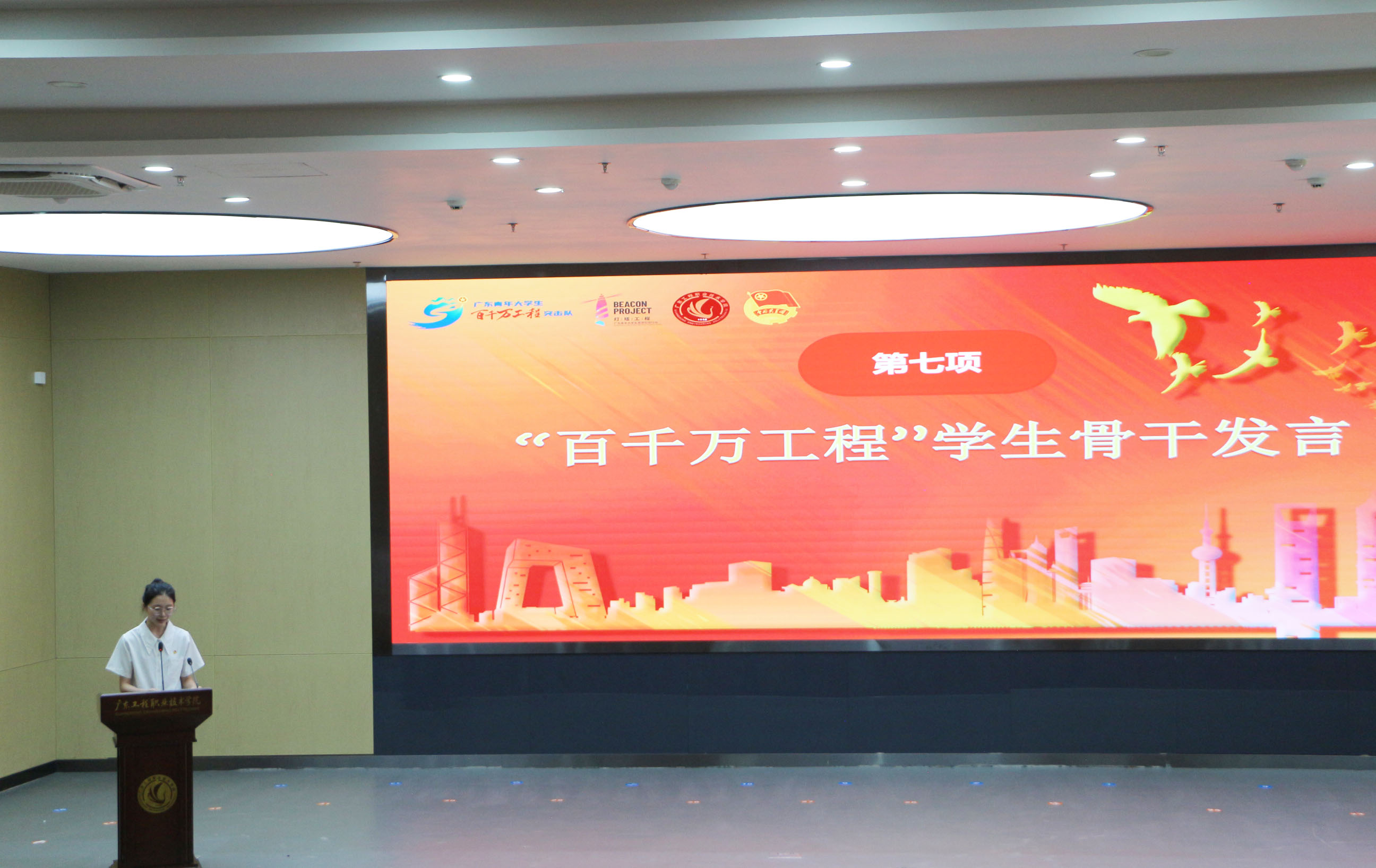 “百千万工程”突击队学生代表蓝子君同学发言表态,表示将时刻注意维护工程青年的形象,以认真负责的态度全力以赴,体现工程青年的专业精神和担当意识,在实践中要树立安全第一的意识。用汗水和智慧,在祖国建设的道路上留下粤工程学子青春的足迹。