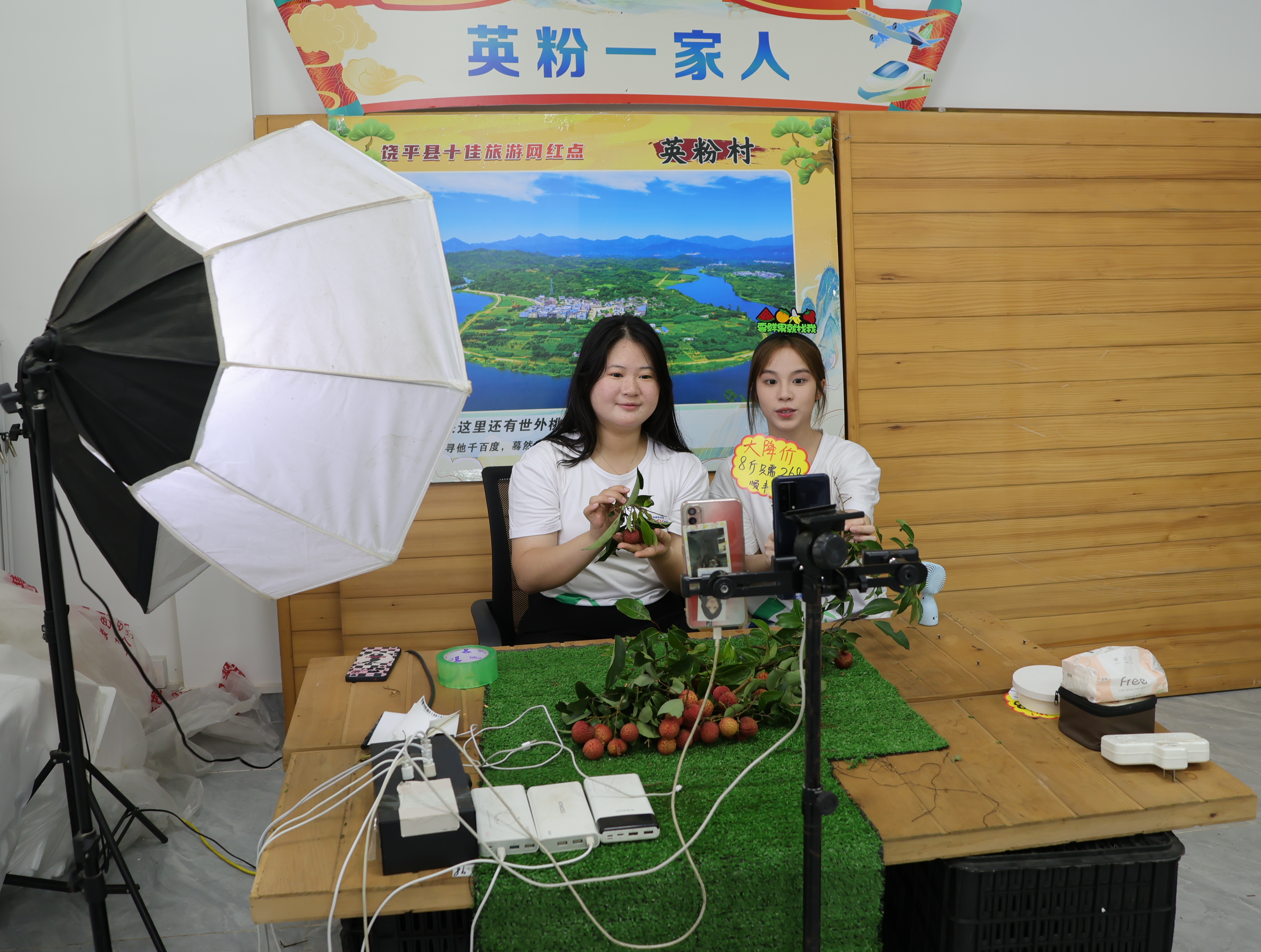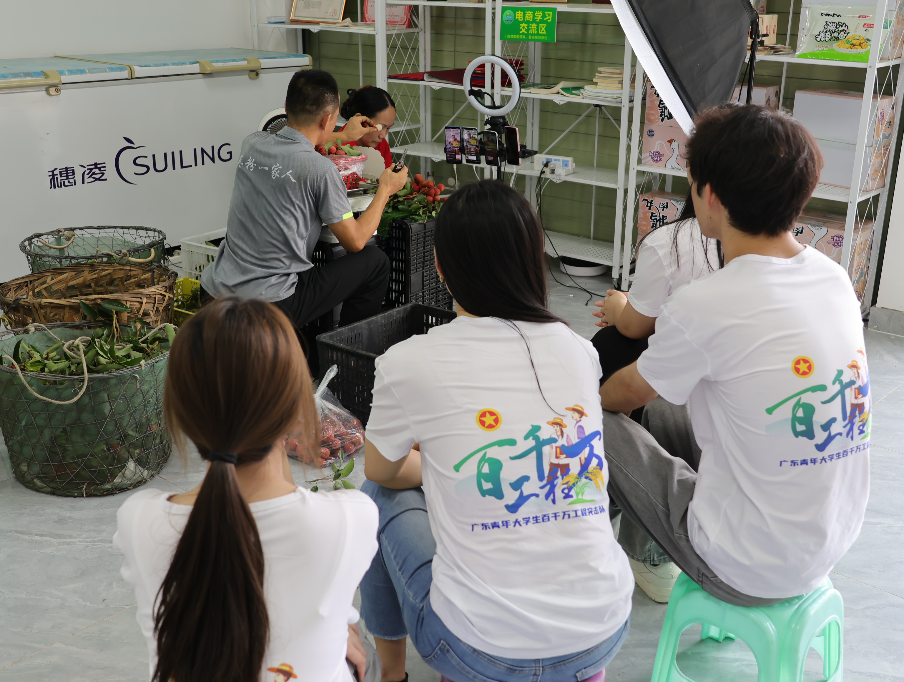 在“英粉一家人”抖音直播间,实践队员观摩学习了种植园直播带货荔枝的过程,随后化身小主播,现场为英粉村桂味荔枝直播带货,帮助农产品“云出道”。