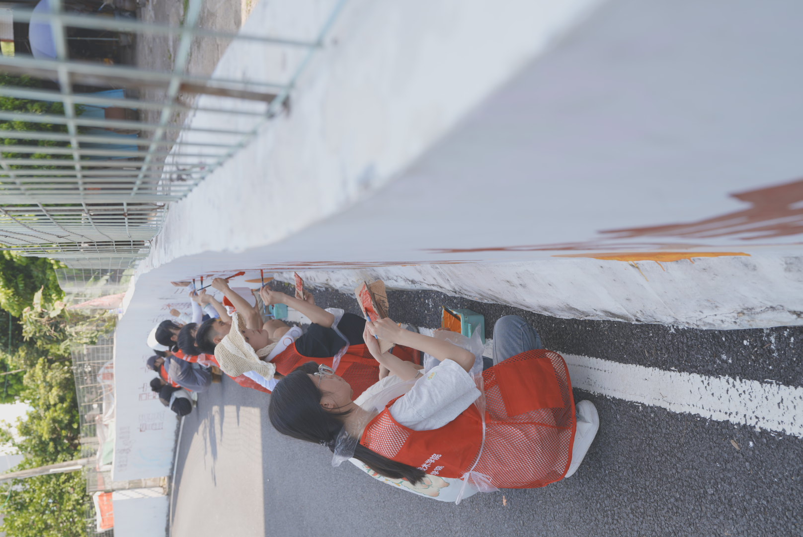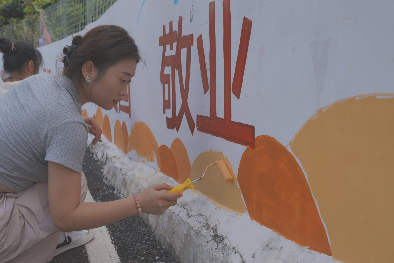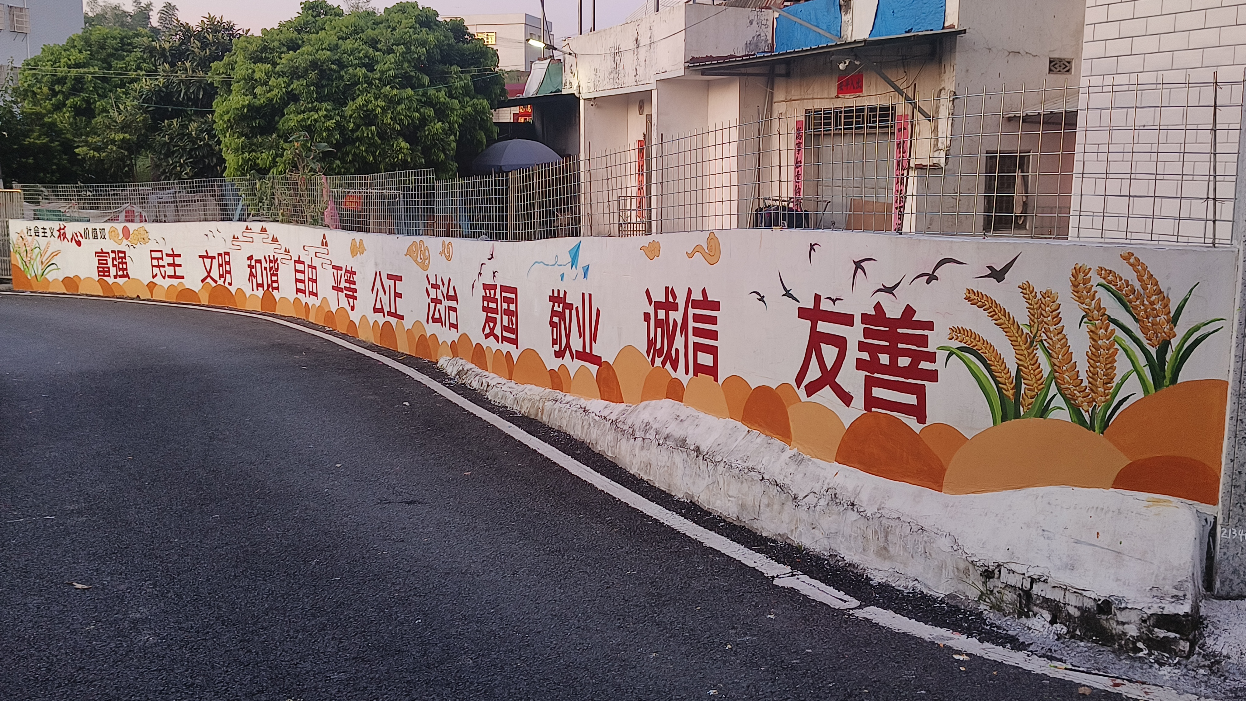 【广东工程职业技术学院艺术设计学院“智绘岭南”突击队成员 谢韩敏:我们也是希望能通过我们所学的一些技艺、技能,运用到这一方面来美化我们的乡村环境,这两天画的内容也是想结合一下我们百千万工程的内容来进行创作,以这个主题来结合乡村的一些美育文化一起来创作这幅画,同时也可以营造宣传我们百千万工程的良好氛围。】