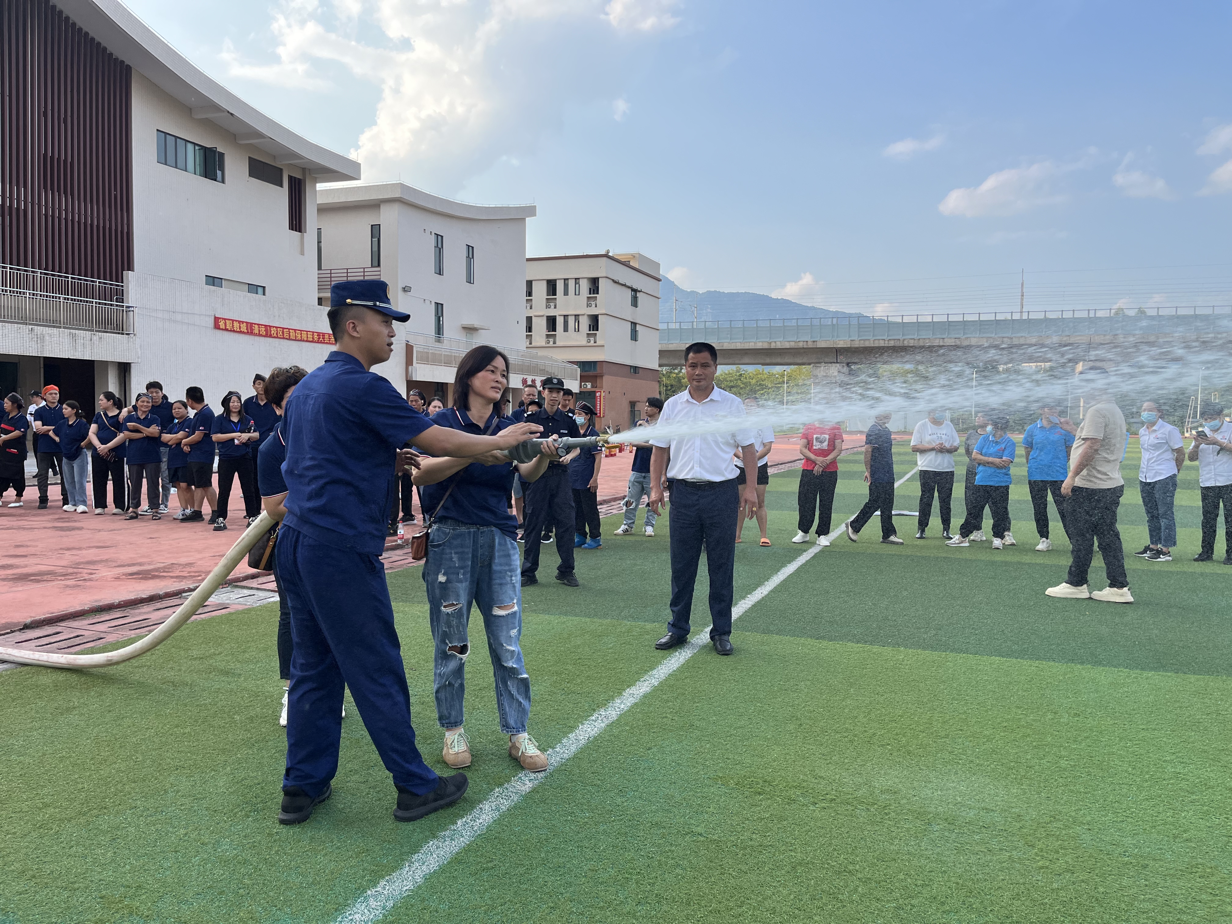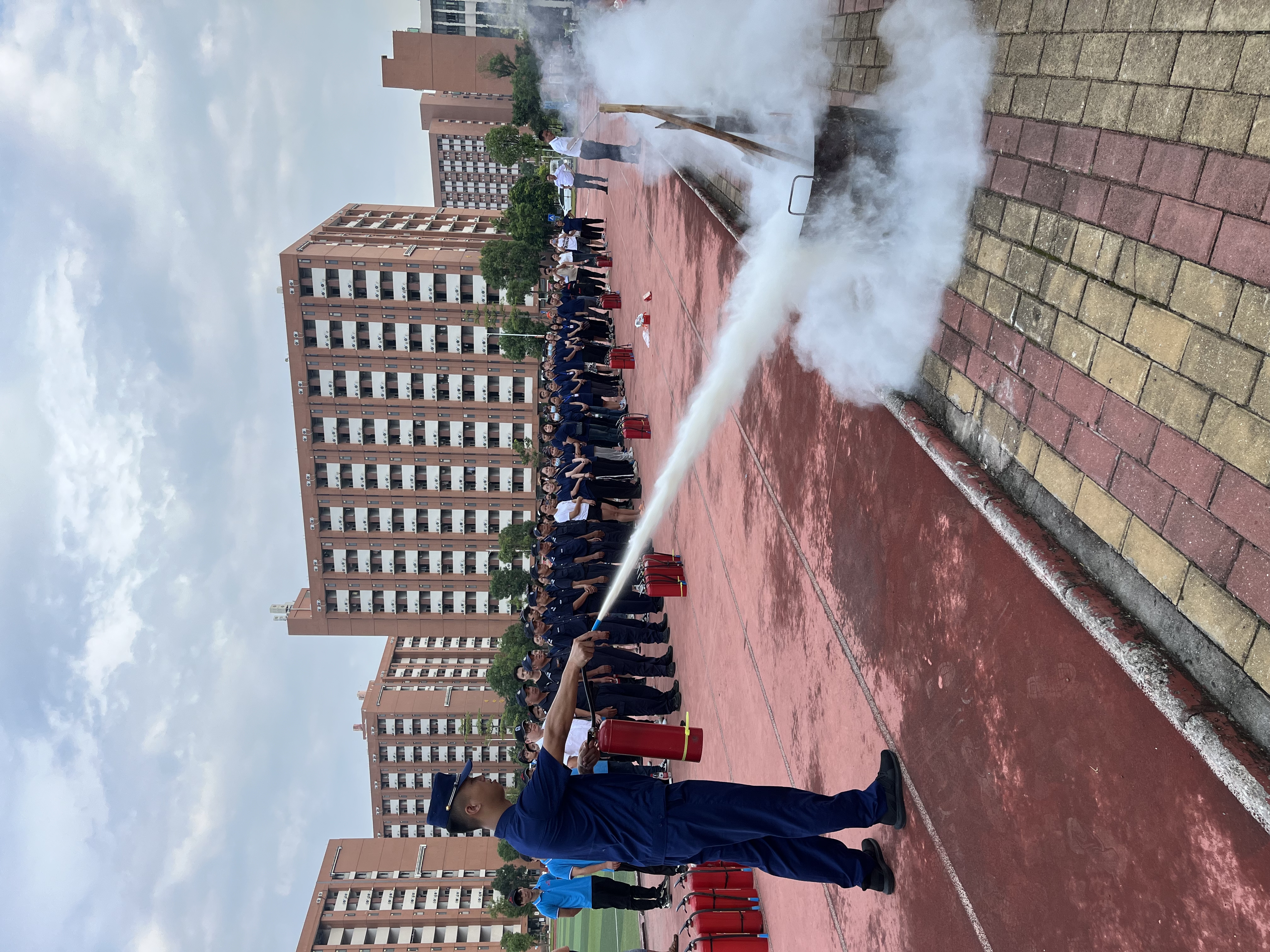 培训第三个环节是消防器材的使用教学及实操训练。李家烙教官现场教授干粉灭火器、消防水带等常用消防器材的正确使用方法,并组织参训人员进行了消防器材的实操练习。