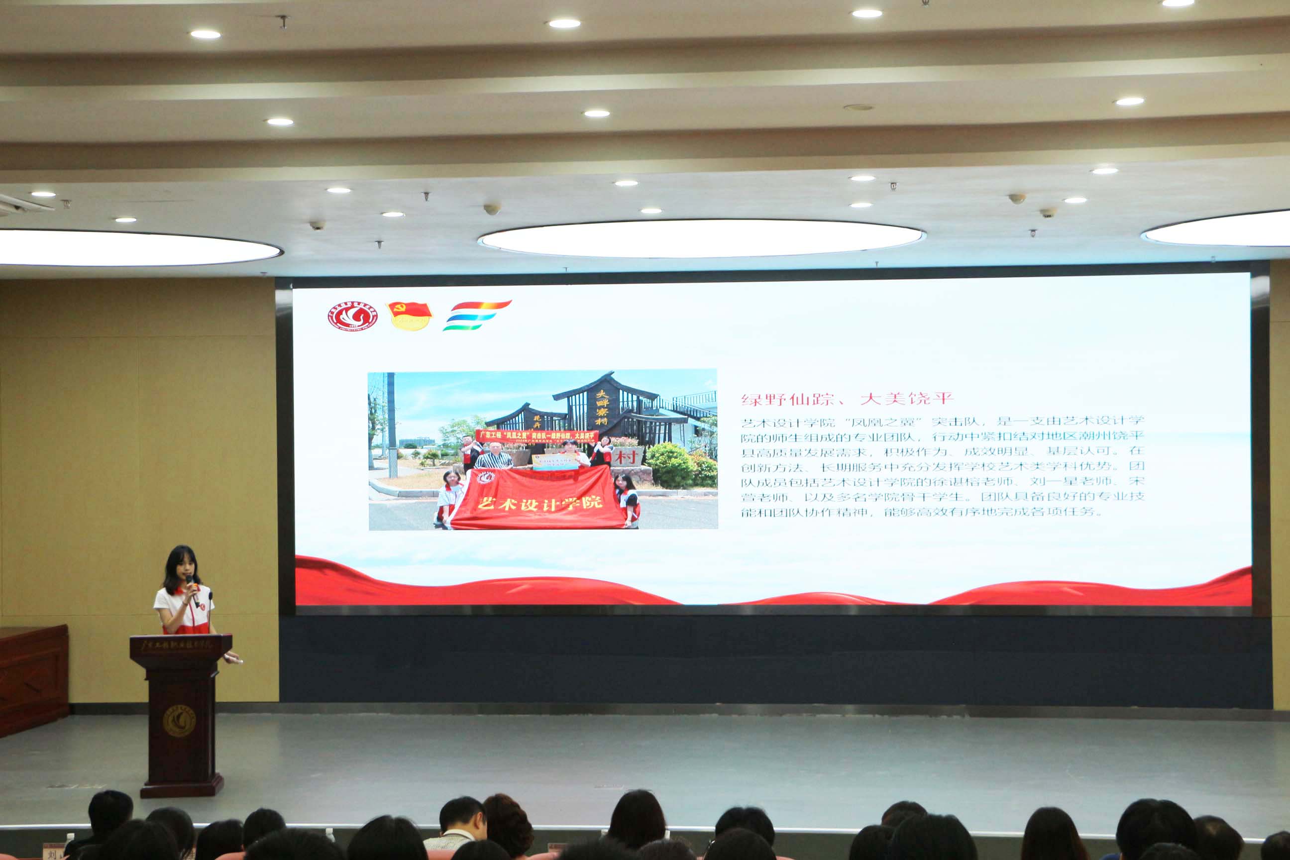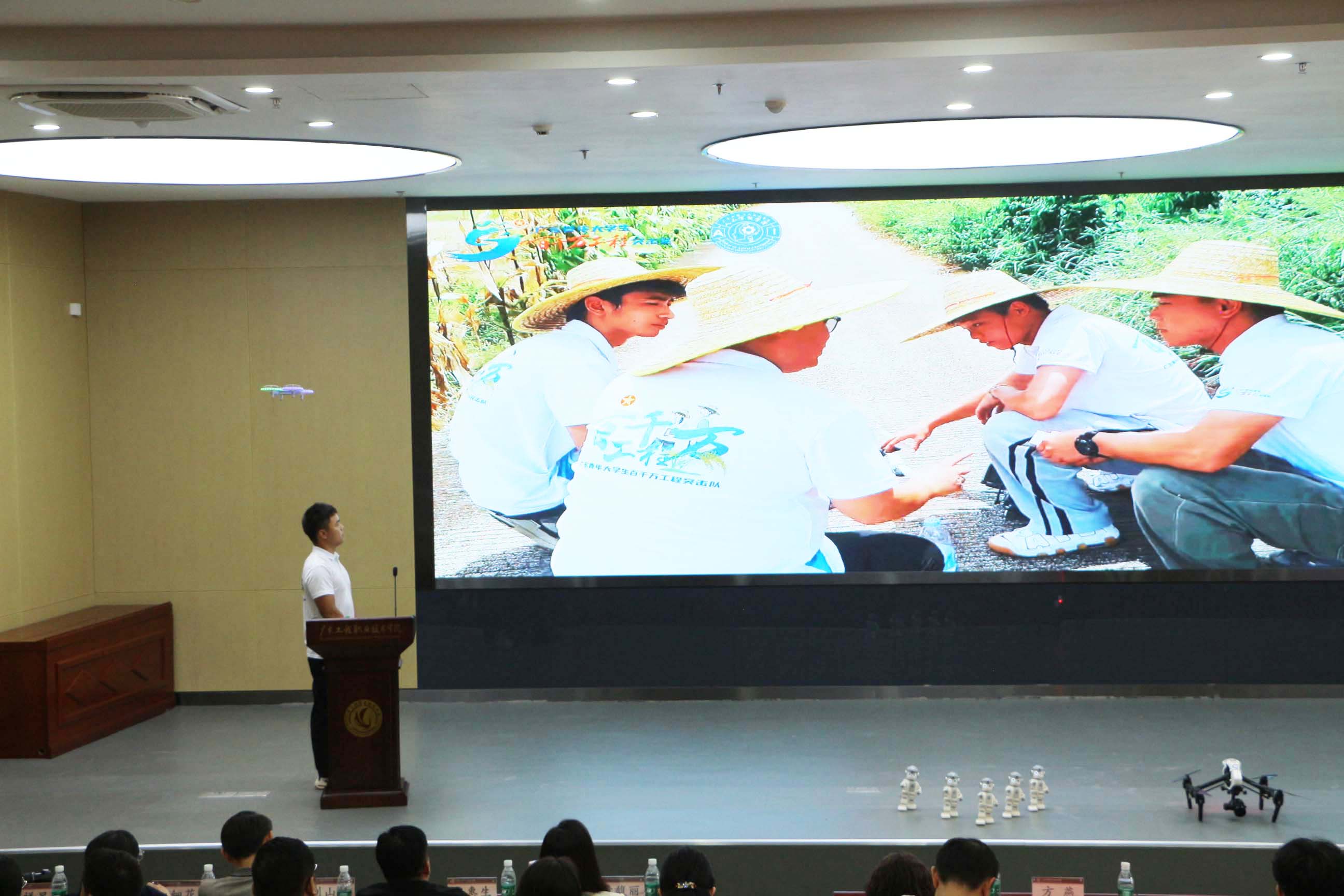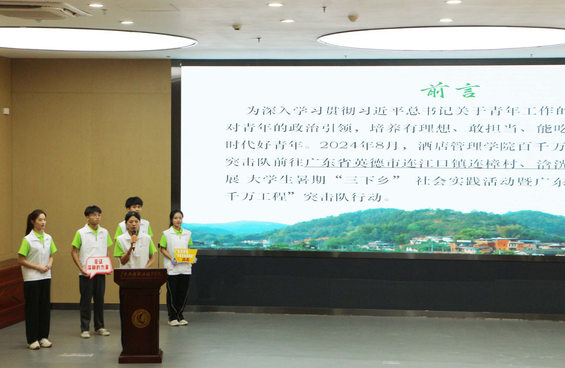 2024年暑期,在校党委的大力支持下,校团委高位推动,统筹谋划,积极做好社会实践工作。6月底,校团委分阶段召开动员大会、出征仪式及线上线下培训会,并积极联络建立3个广东大学生“百千万工程”突击队工作站(饶平工作站、五华工作站、清新山塘工作站);共发动注册118支青年大学生“百千万工程”突击队,其中与相关县镇成功结对41支。大会评选展示环节,14支校级优秀突击队代表依次上台,通过PPT展示和汇报演讲,生动分享了他们在“百千万工程”中的实践经历与丰硕成果。从新媒体直播带货的创新实践到智能无人机助农应用的技术探索,从特色墙绘的文化传播到乡村文创产品的设计研发,各突击队充分展示了青年学子的创新思维和实践能力,为乡村振兴注入了新的活力。