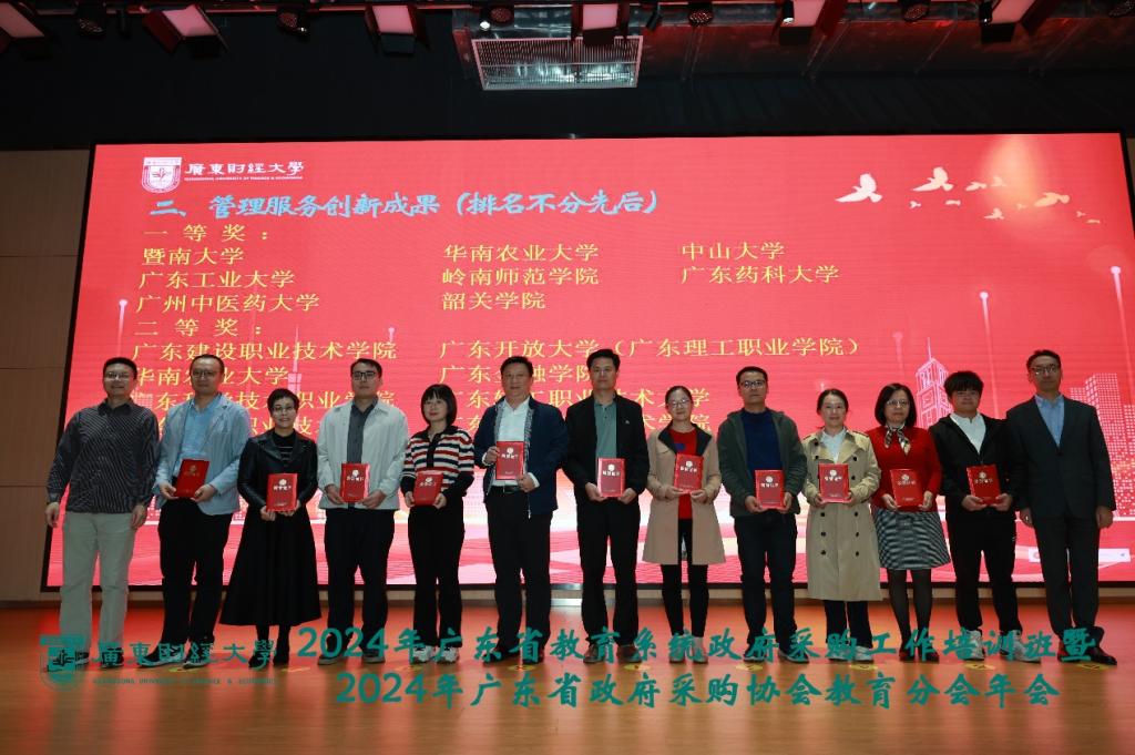 在本次会议上,我校取得重大历史突破,学校首次获评“2024年度高校采购工作先进集体”、管理服务创新成果二等奖,陈运财获评“2024年度高校采购工作先进个人”三项殊荣,也是我省本年度唯一一所同时获得以上荣誉的高职院校。与此同时,我校受广东省政府采购协会教育分会邀请,以《跨平台采资业务一体化流程开发实施探索》为主题,在大会上分享了我校在政府采购领域的有效做法与先进工作经验。