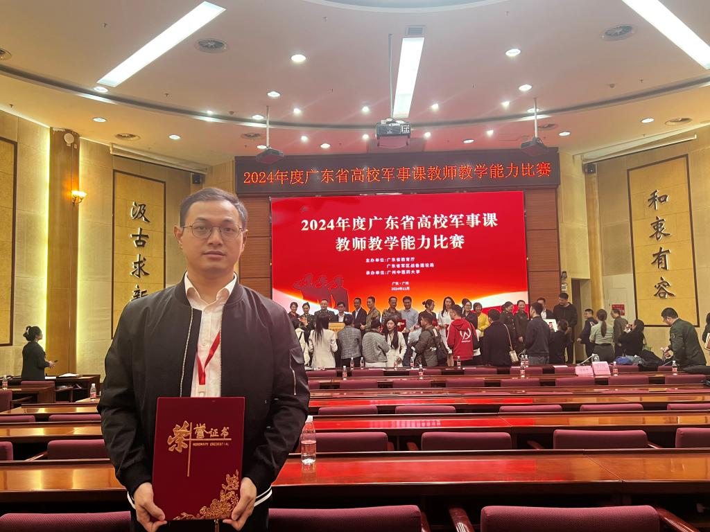 2024年11月29-12月1日,由广东省教育厅、广东省军区战备建设局联合主办的2024年度全省高校军事课教师教学能力比赛(决赛)在广州中医药大学大学城校区举行。我校军事理论课教师查宇驰从全省51支高校队伍,80名参赛选手中脱颖而出进入决赛,经过军事理论授课、模拟射击、单个军人队列动作等环节的比拼,荣获全省二等奖的优异成绩。