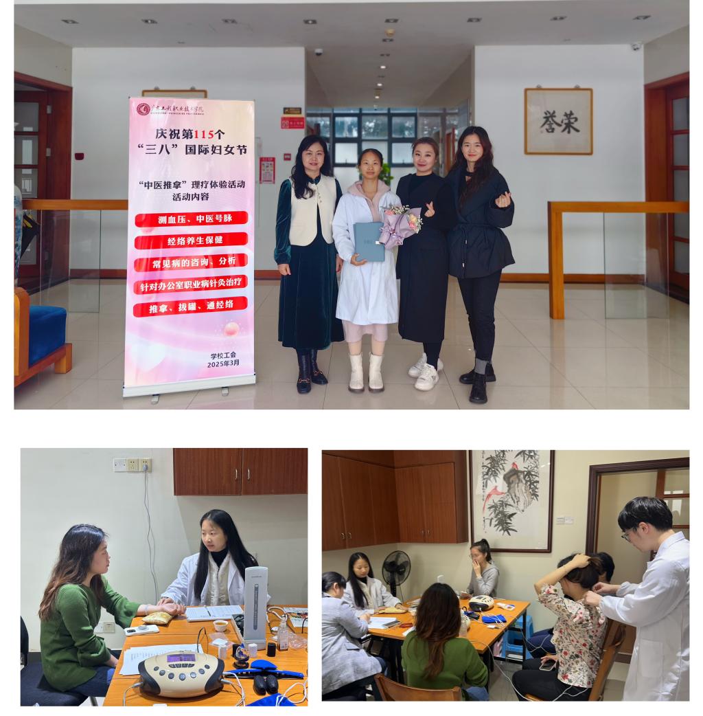 学校工会精心组织了“中医推拿”健康服务活动。从3月3-7日,联合南方医科大学中医药学院的志愿者们走进“职工之家”,为教职工开展中医理疗服务,针对办公室职业病开展针灸治疗、拔罐、通经络等,帮助她们缓解工作压力,放松身心。